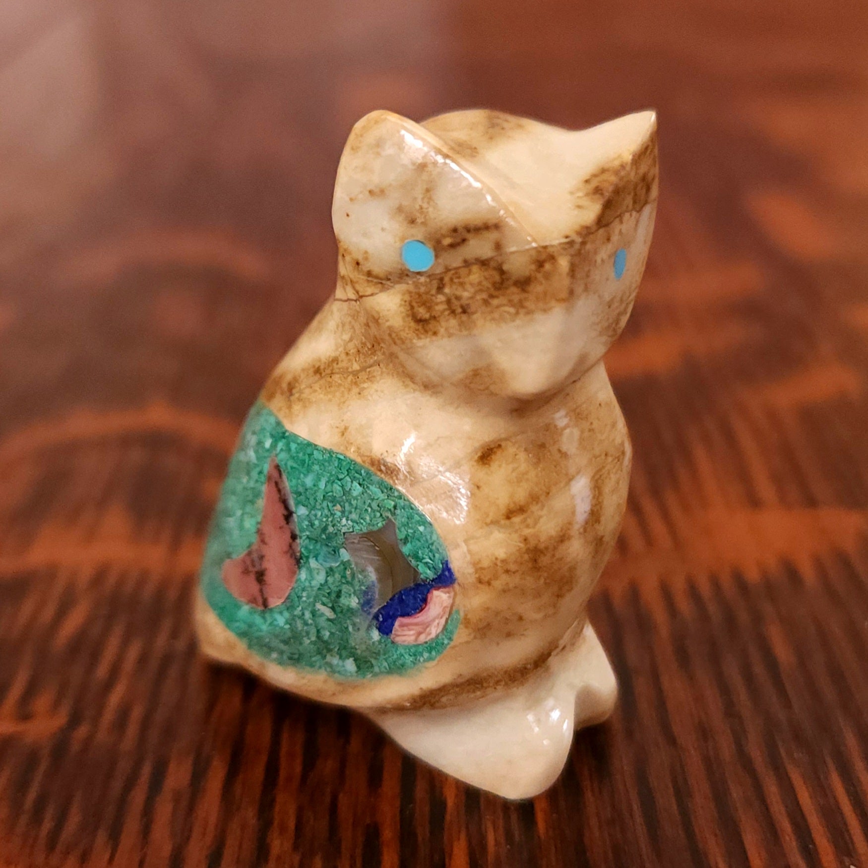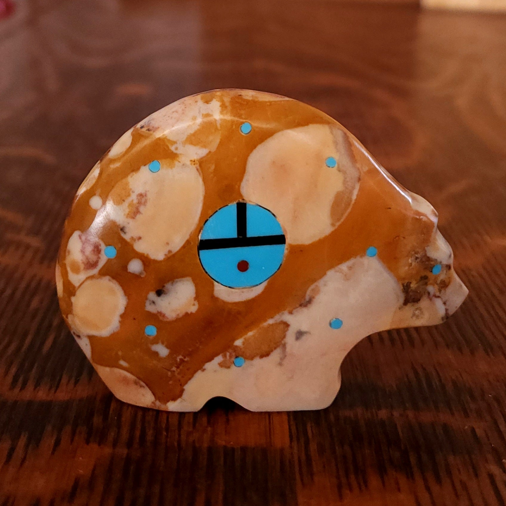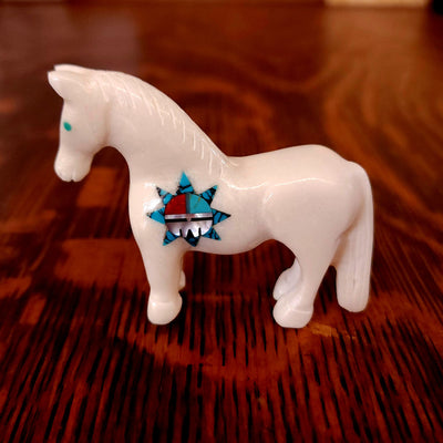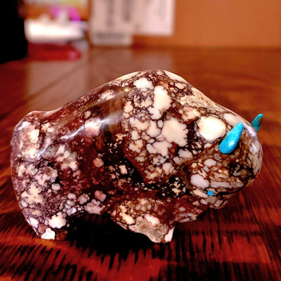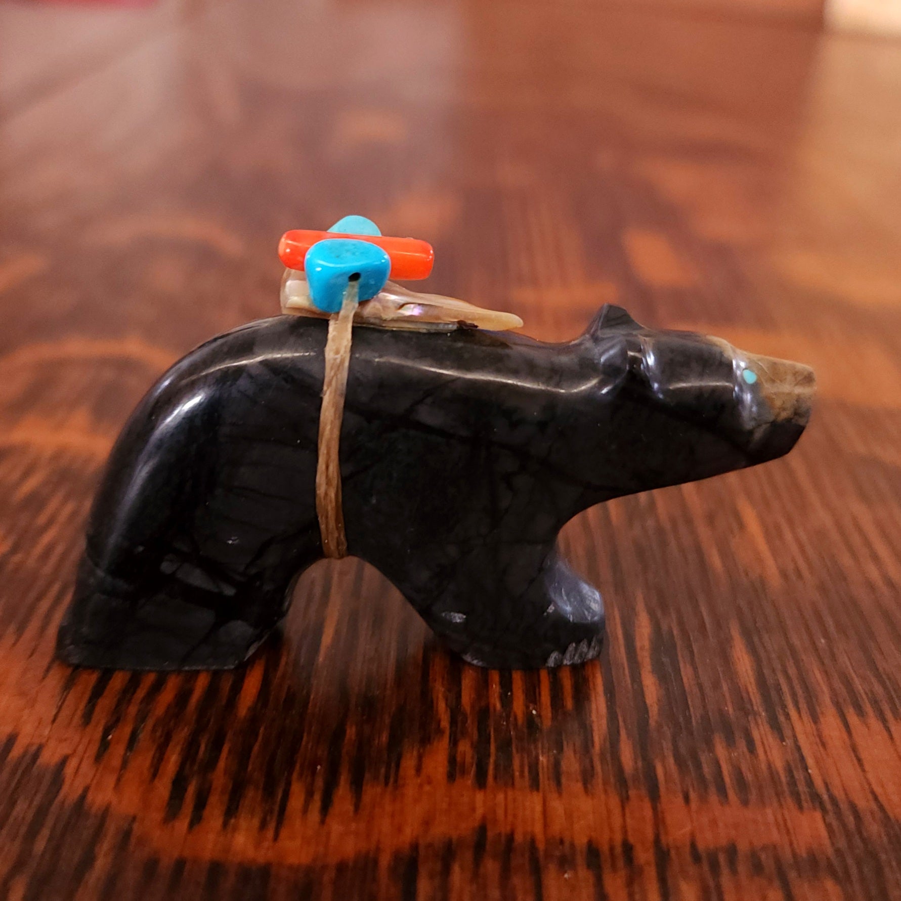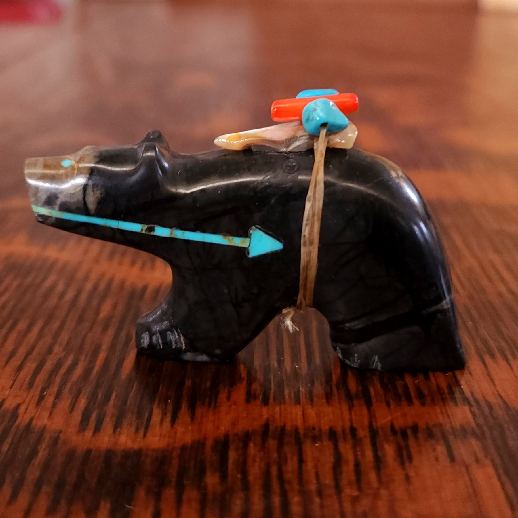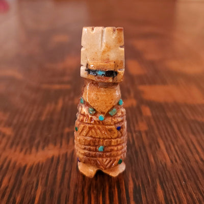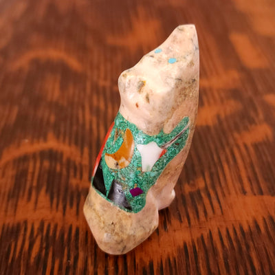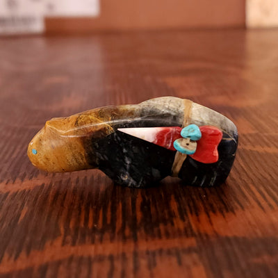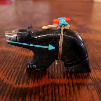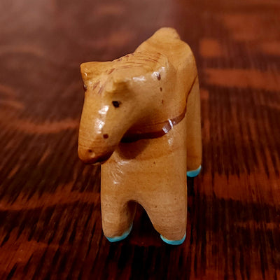 Traditionally, Zuni carvings are symbolically fed cornmeal. Each Zuni fetish comes in a box with a descriptive card and a tiny bit of corn meal to tide them over until they reach you.