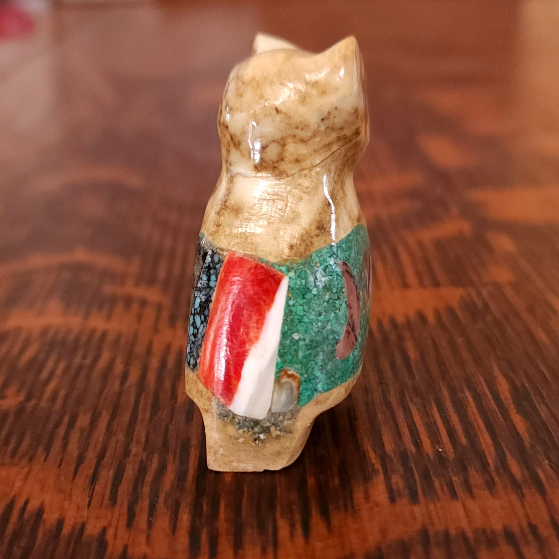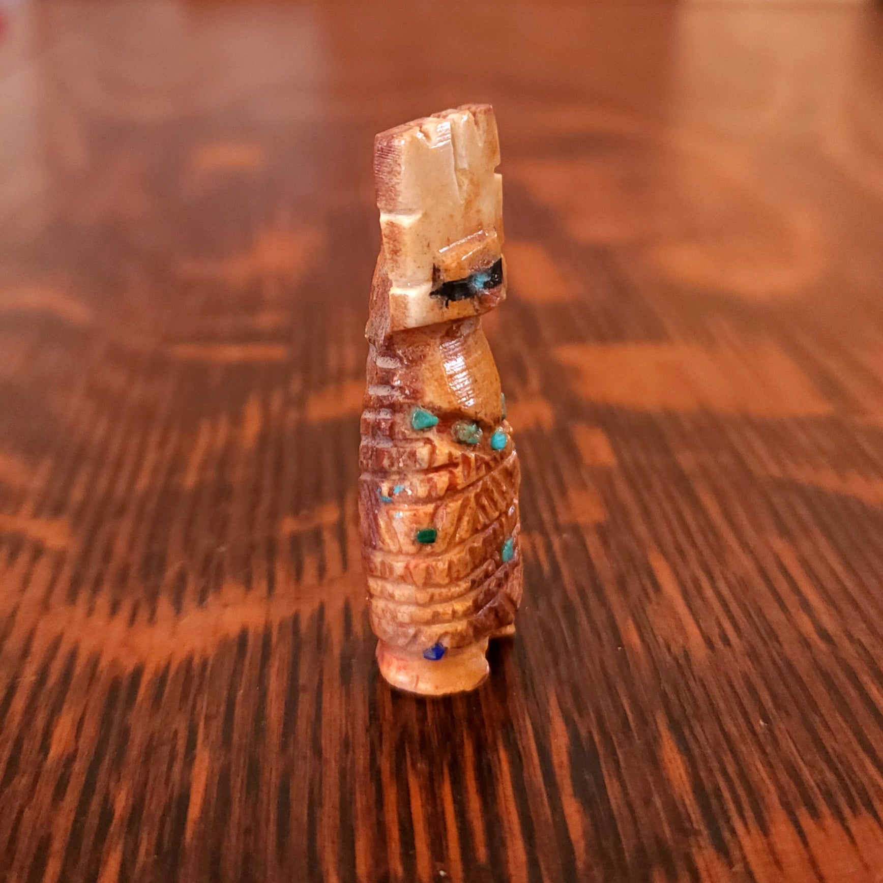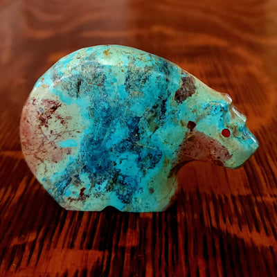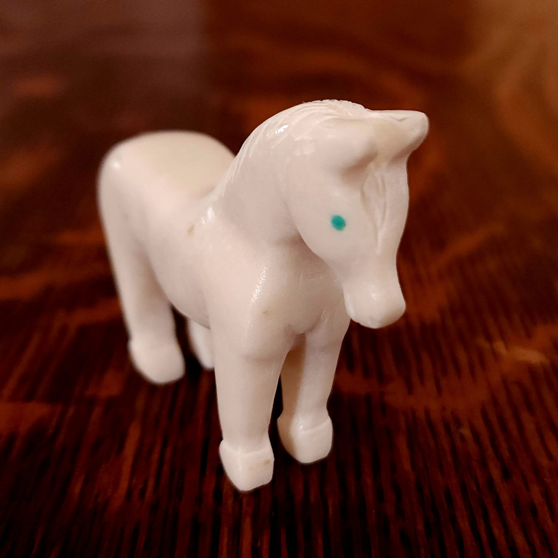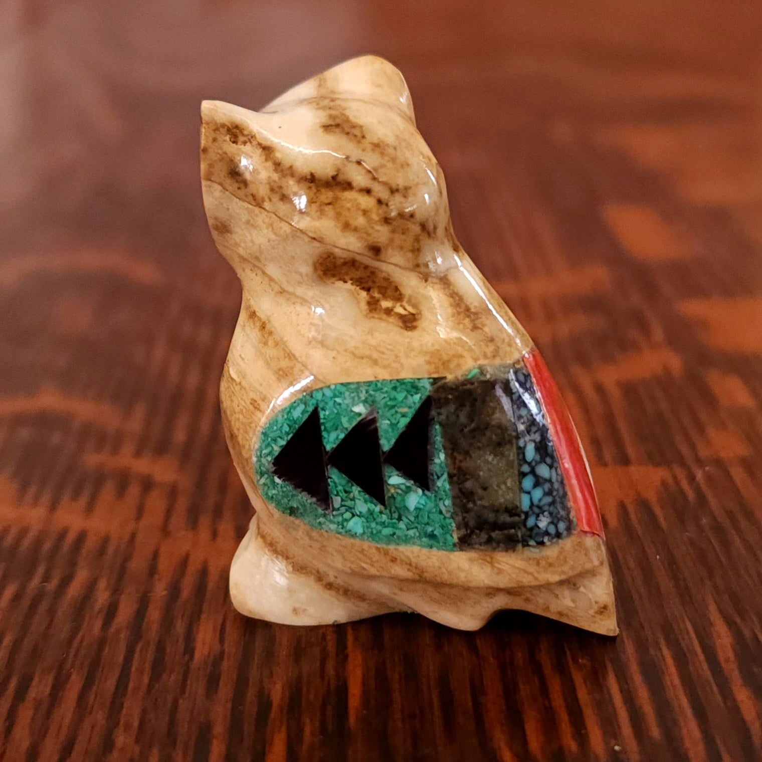 Traditionally, Zuni carvings are symbolically fed cornmeal. Each Zuni fetish comes in a box with a descriptive card and a tiny bit of corn meal to tide them over until they reach you.