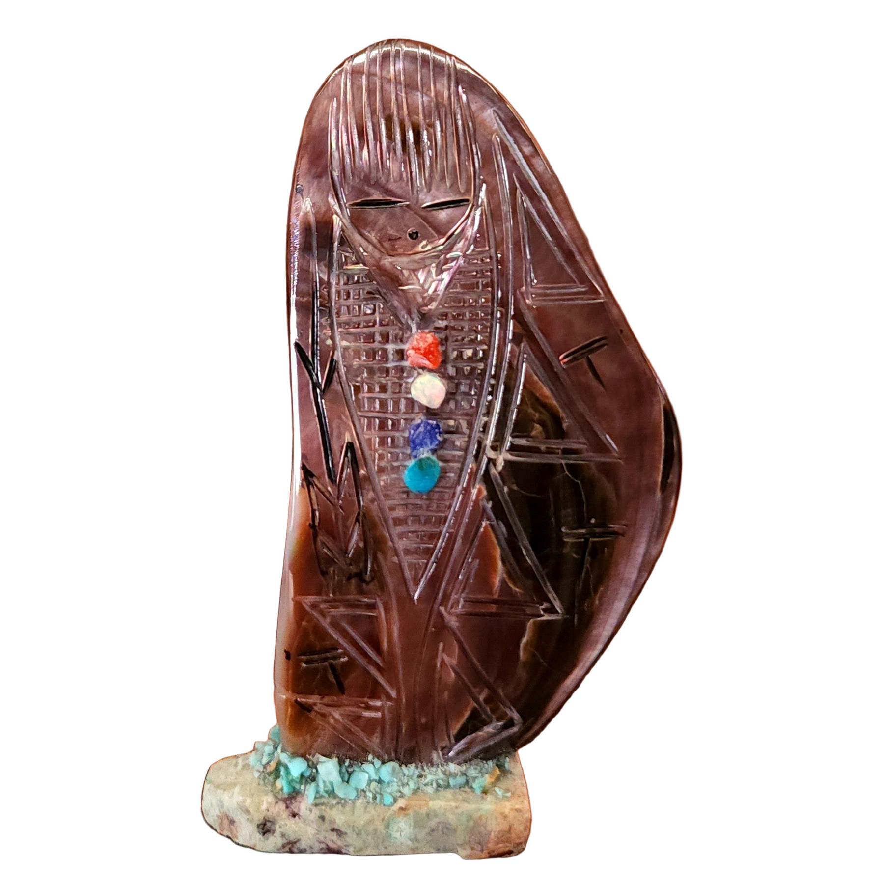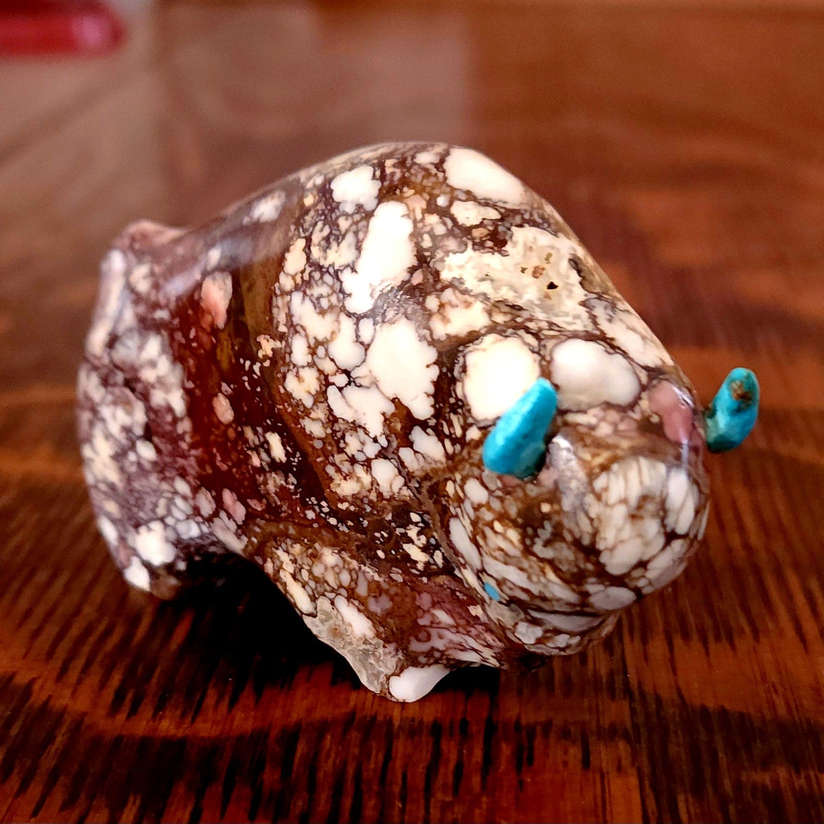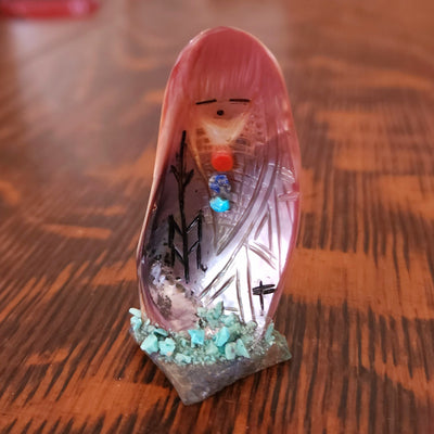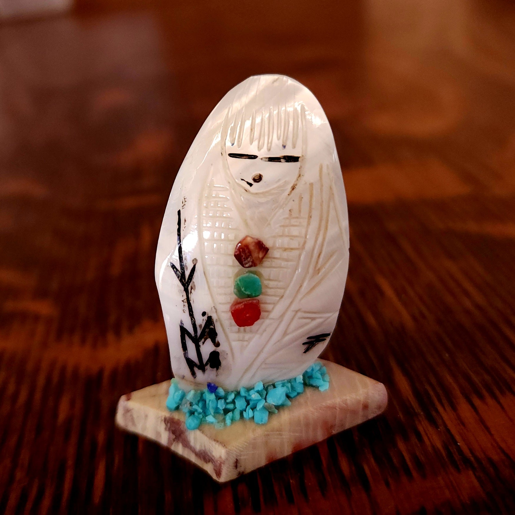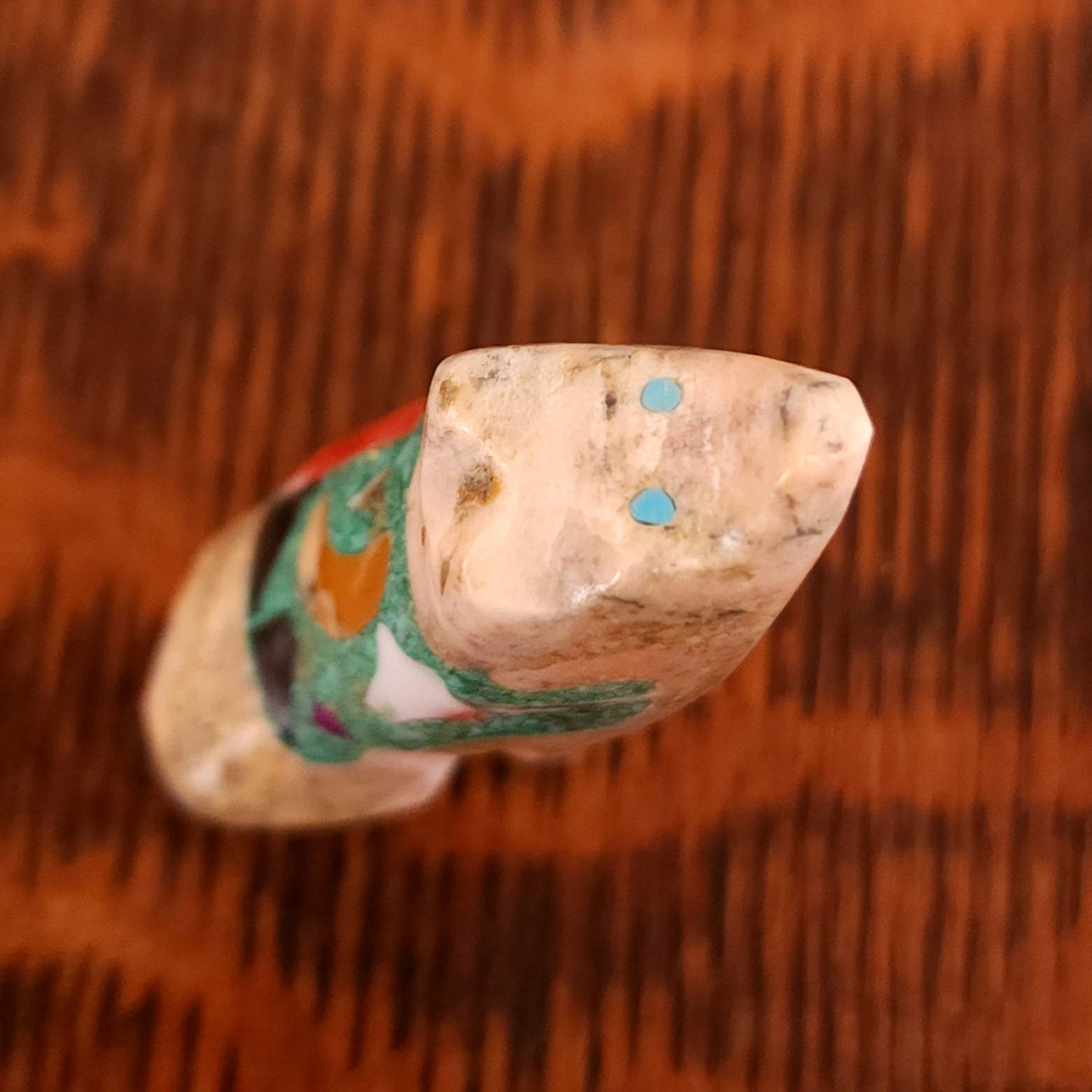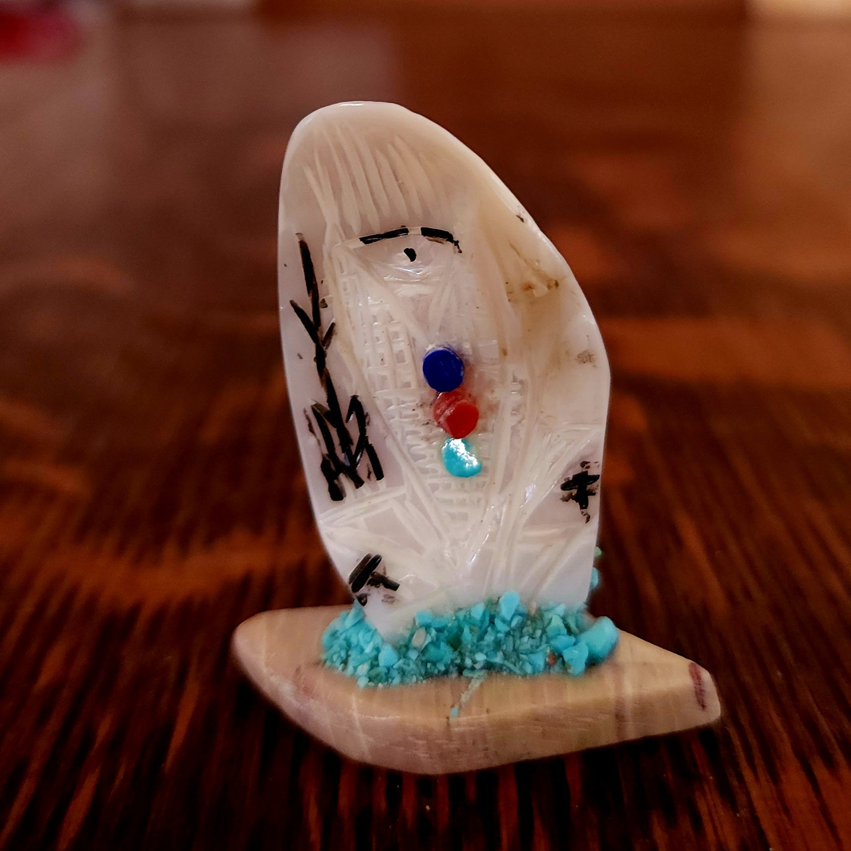 Traditionally, Zuni carvings are symbolically fed cornmeal. Each Zuni fetish comes in a box with a descriptive card and a tiny bit of corn meal to tide them over until they reach you.