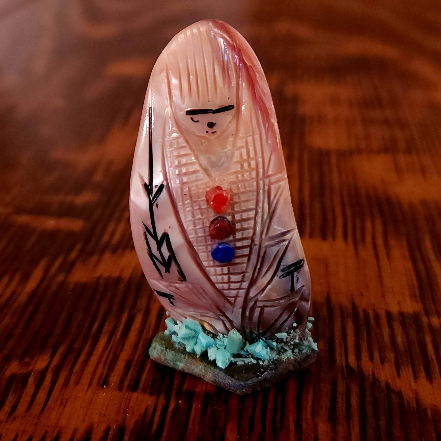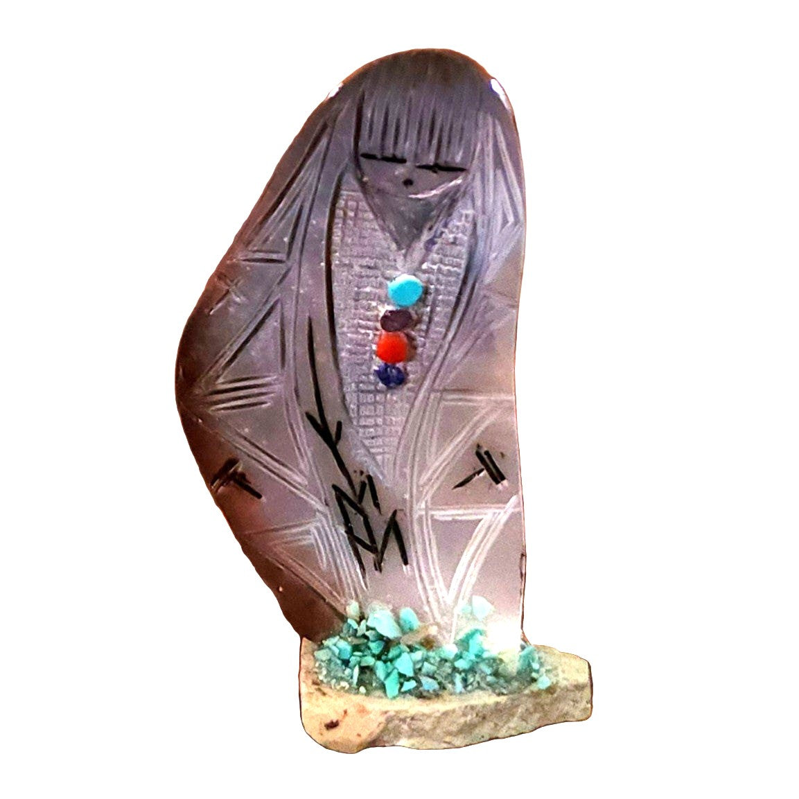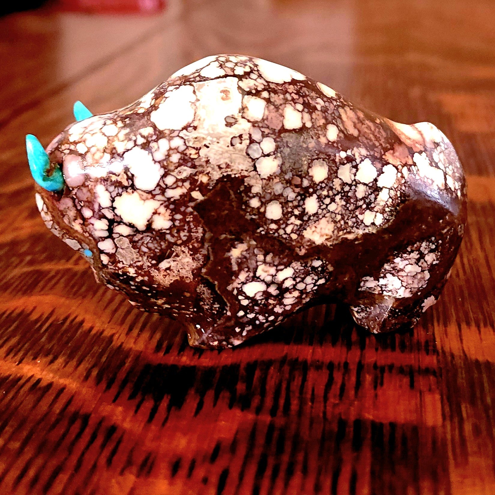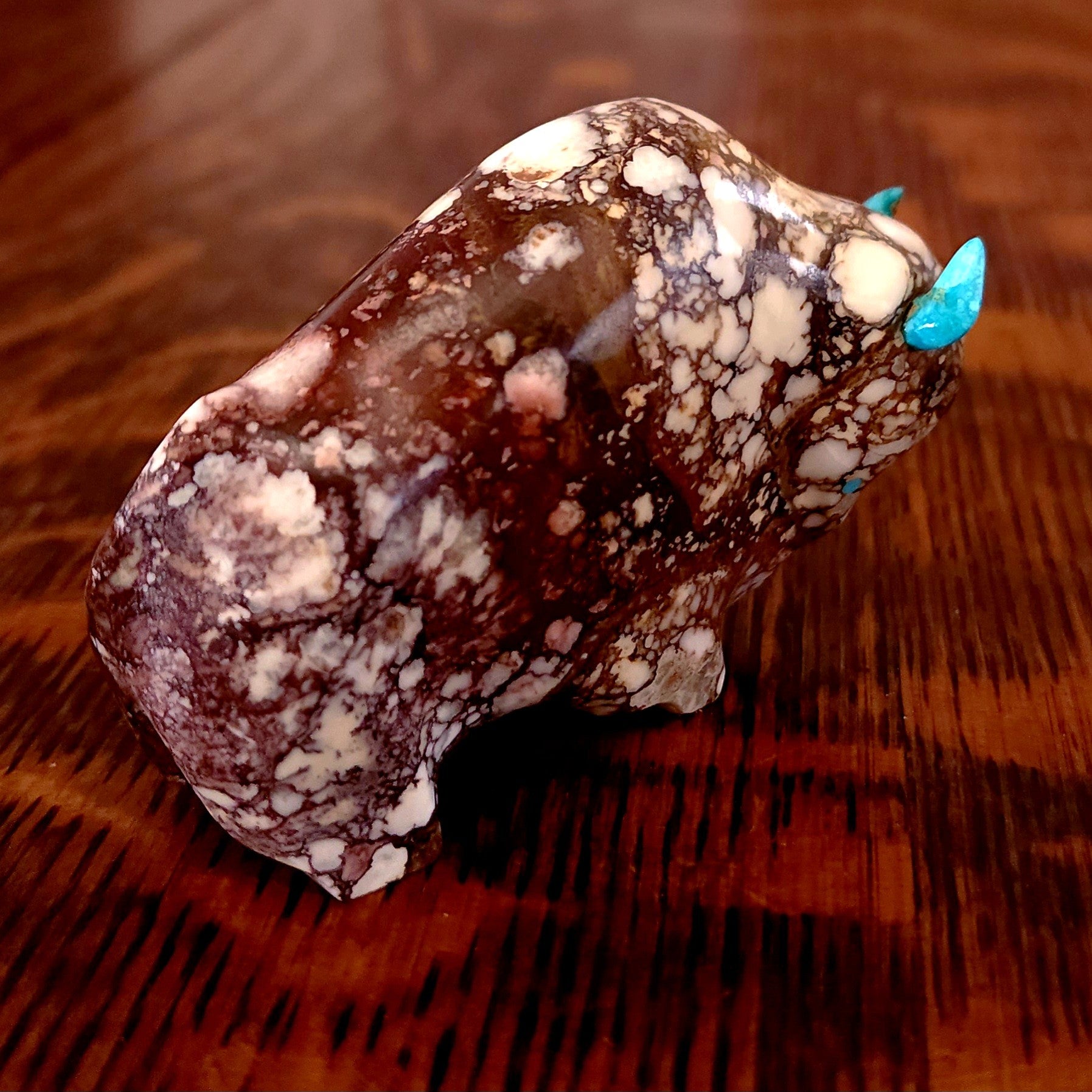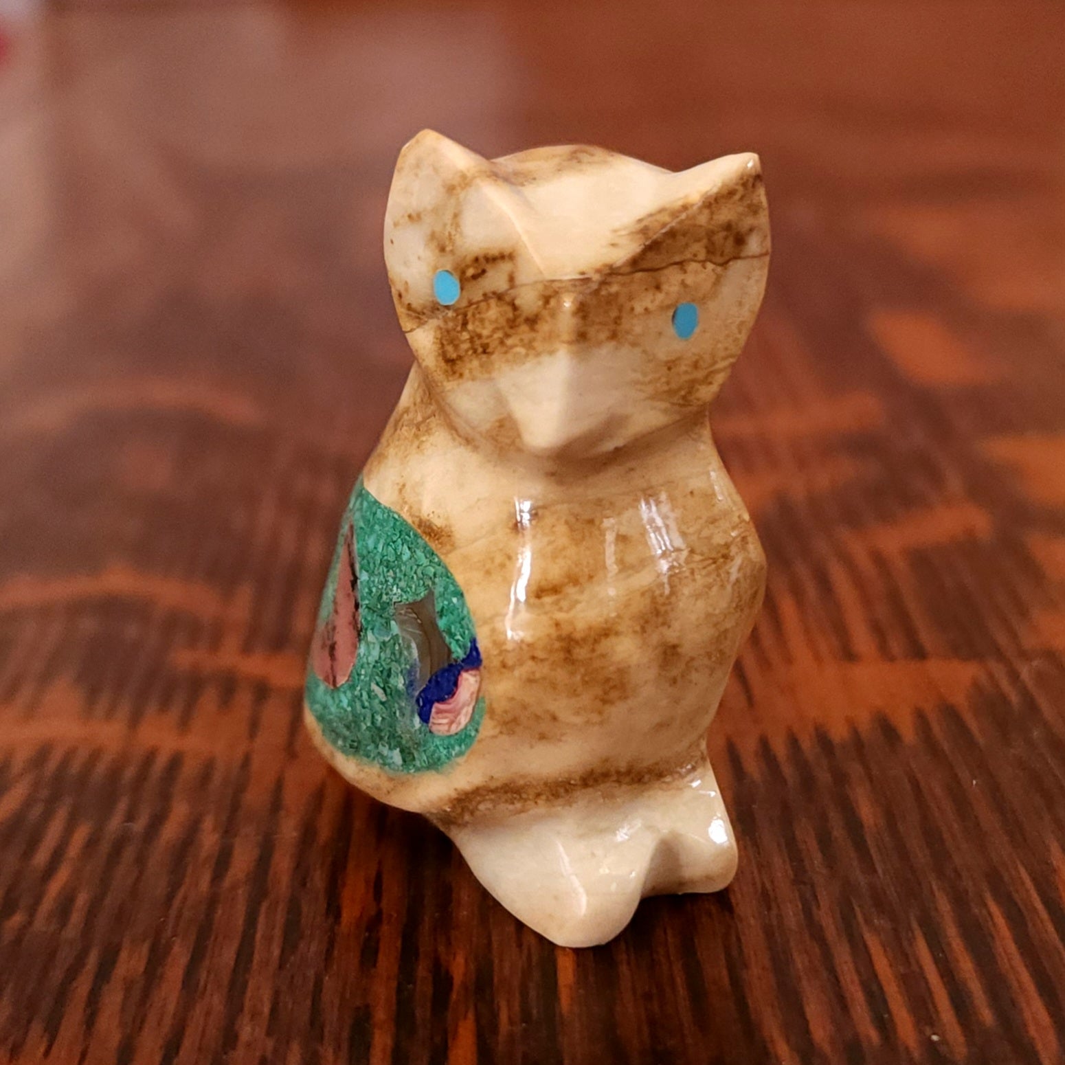 Traditionally, Zuni carvings are symbolically fed cornmeal. Each Zuni fetish comes in a box with a descriptive card and a tiny bit of corn meal to tide them over until they reach you.