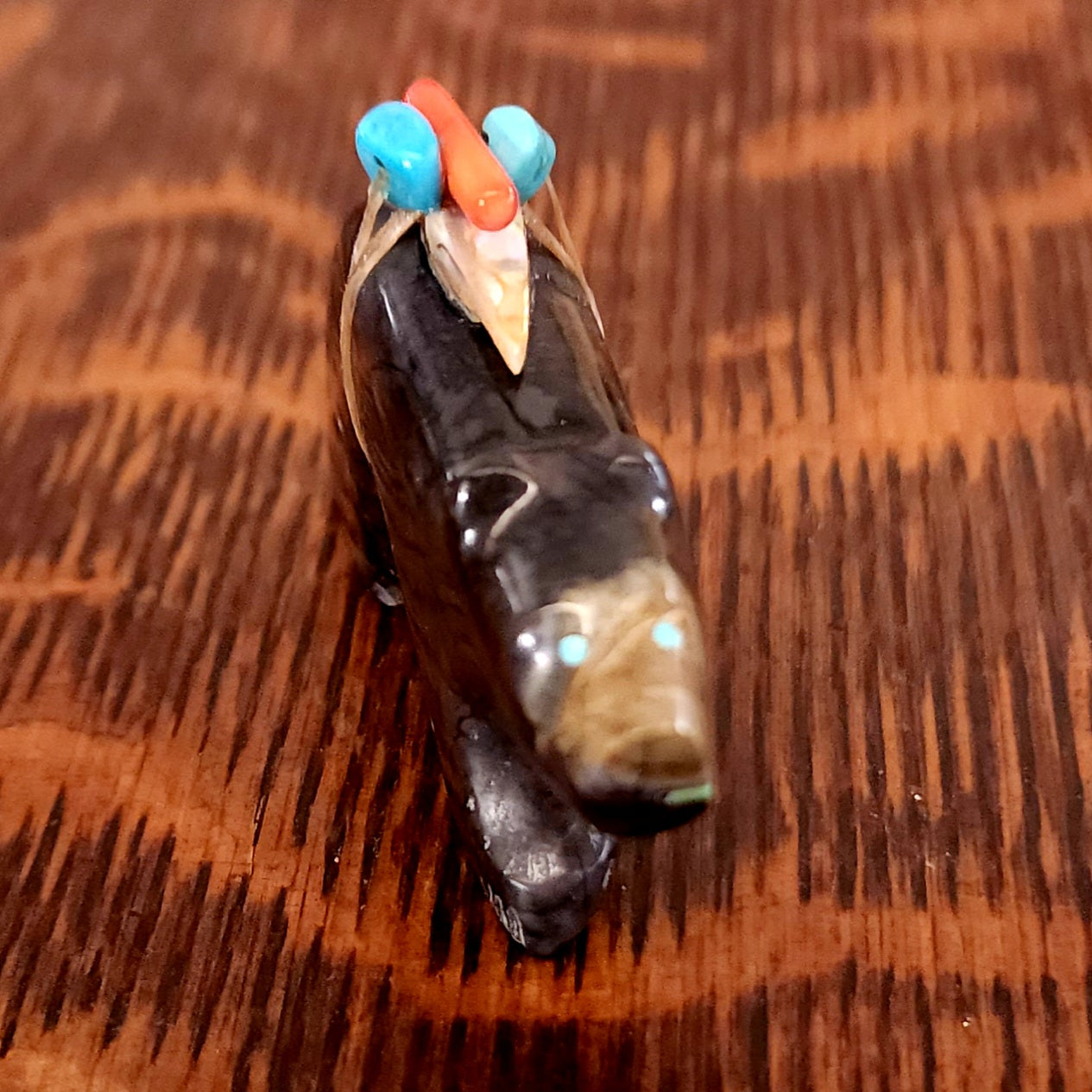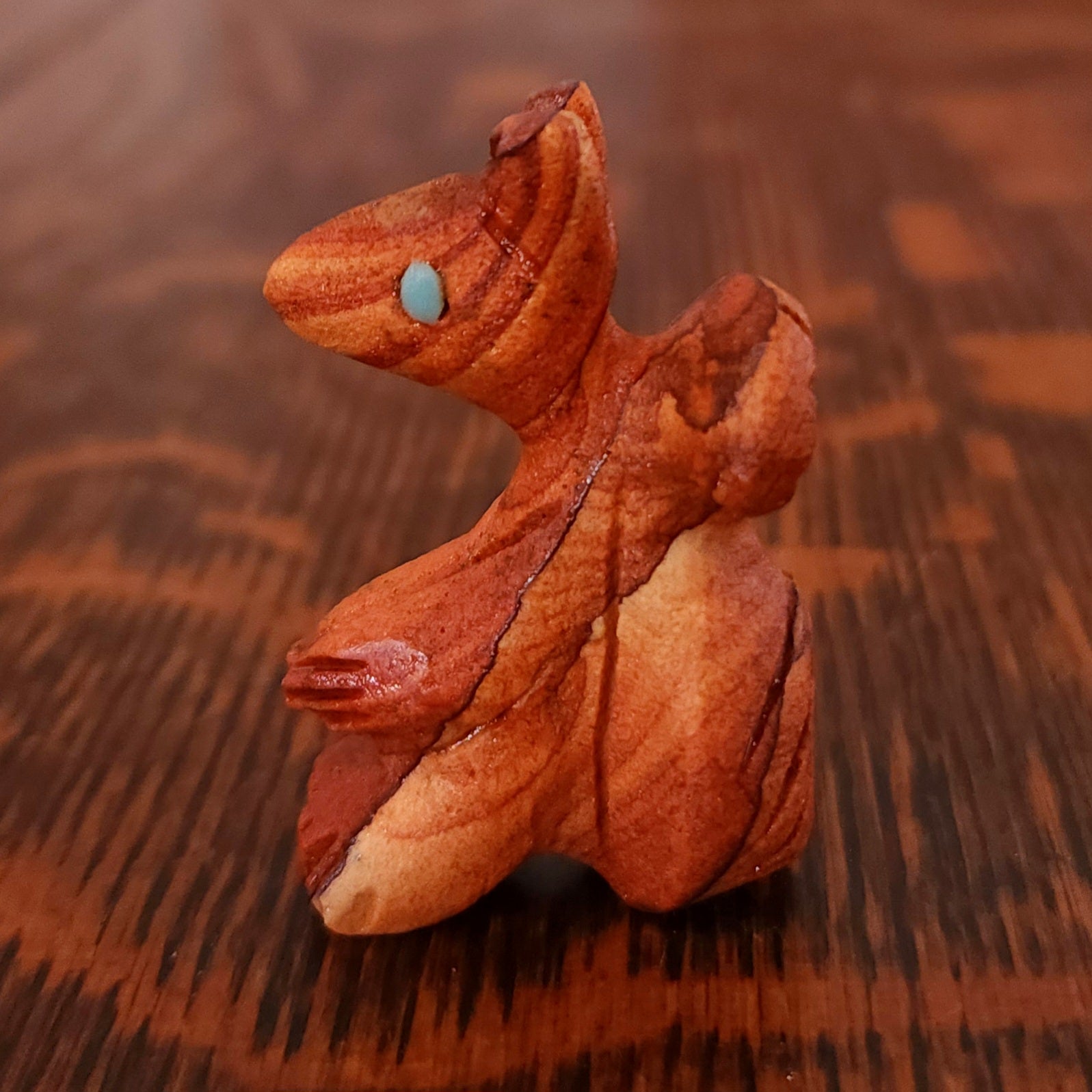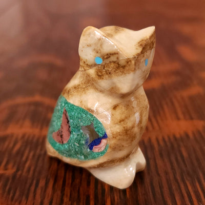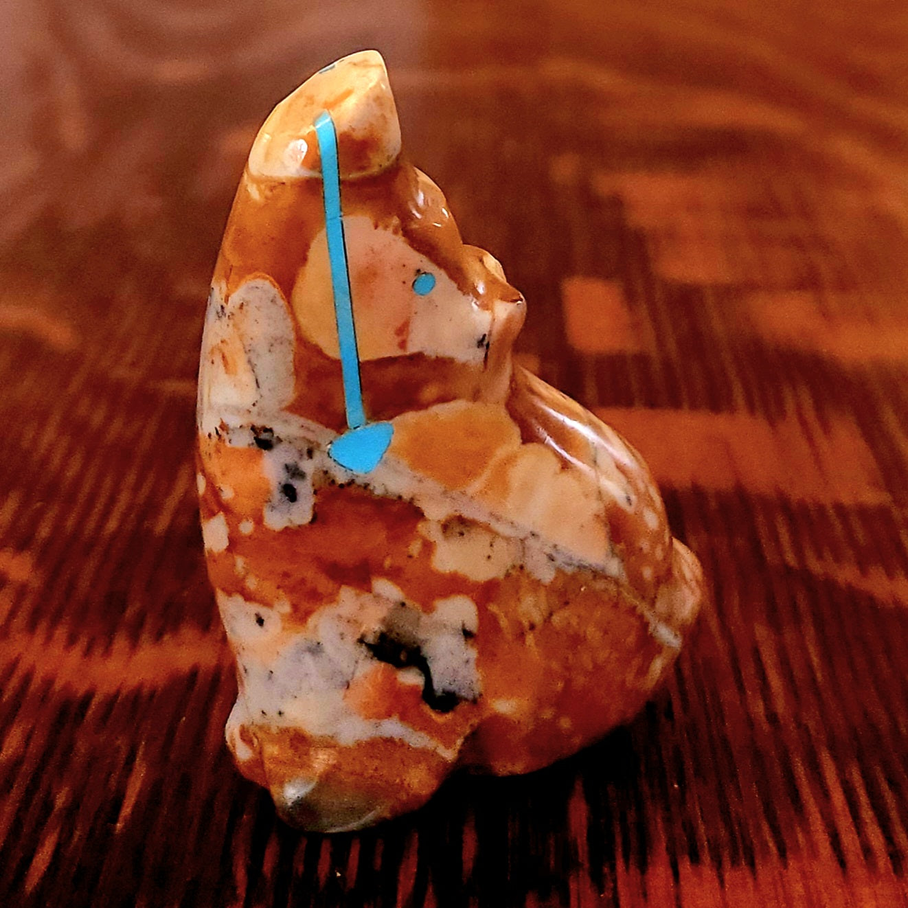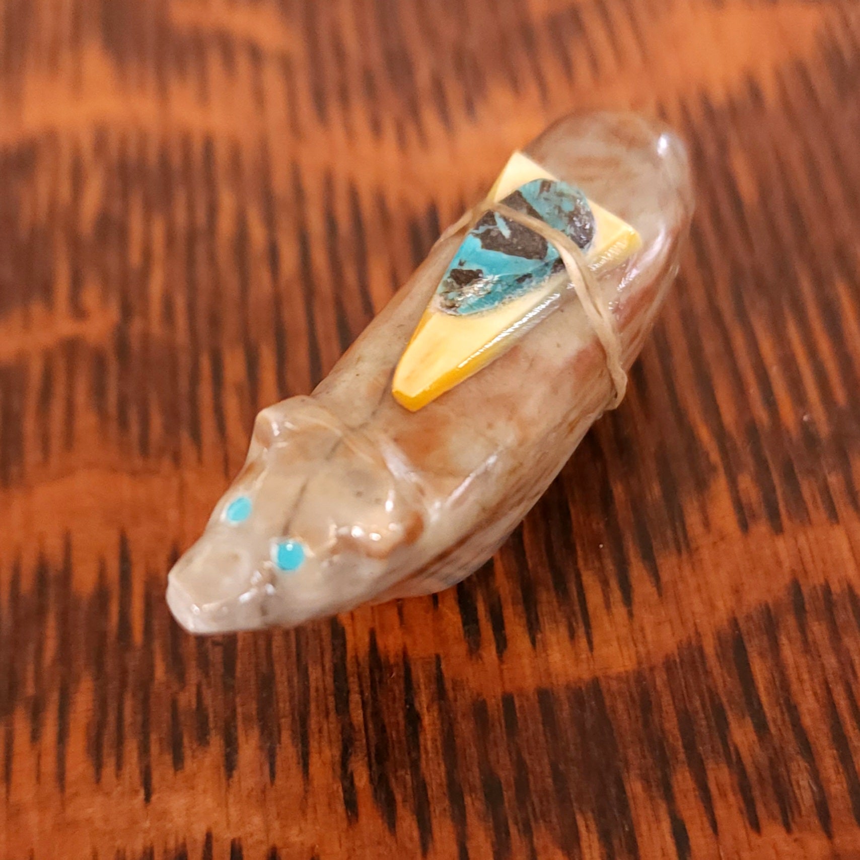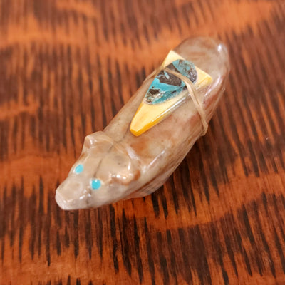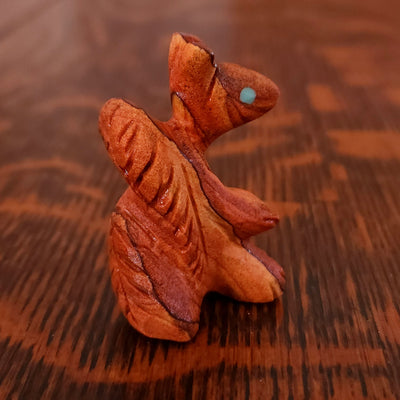 Lynn and Jayne Quam artfully carved and inlaid this Moon Gazing Bushytail from tijilite. It has inlaid turquoise eyes and heartlines on each side. It feels very good in the hand. Signed "Lynn Quam" on the bottom. More about bushytails below.