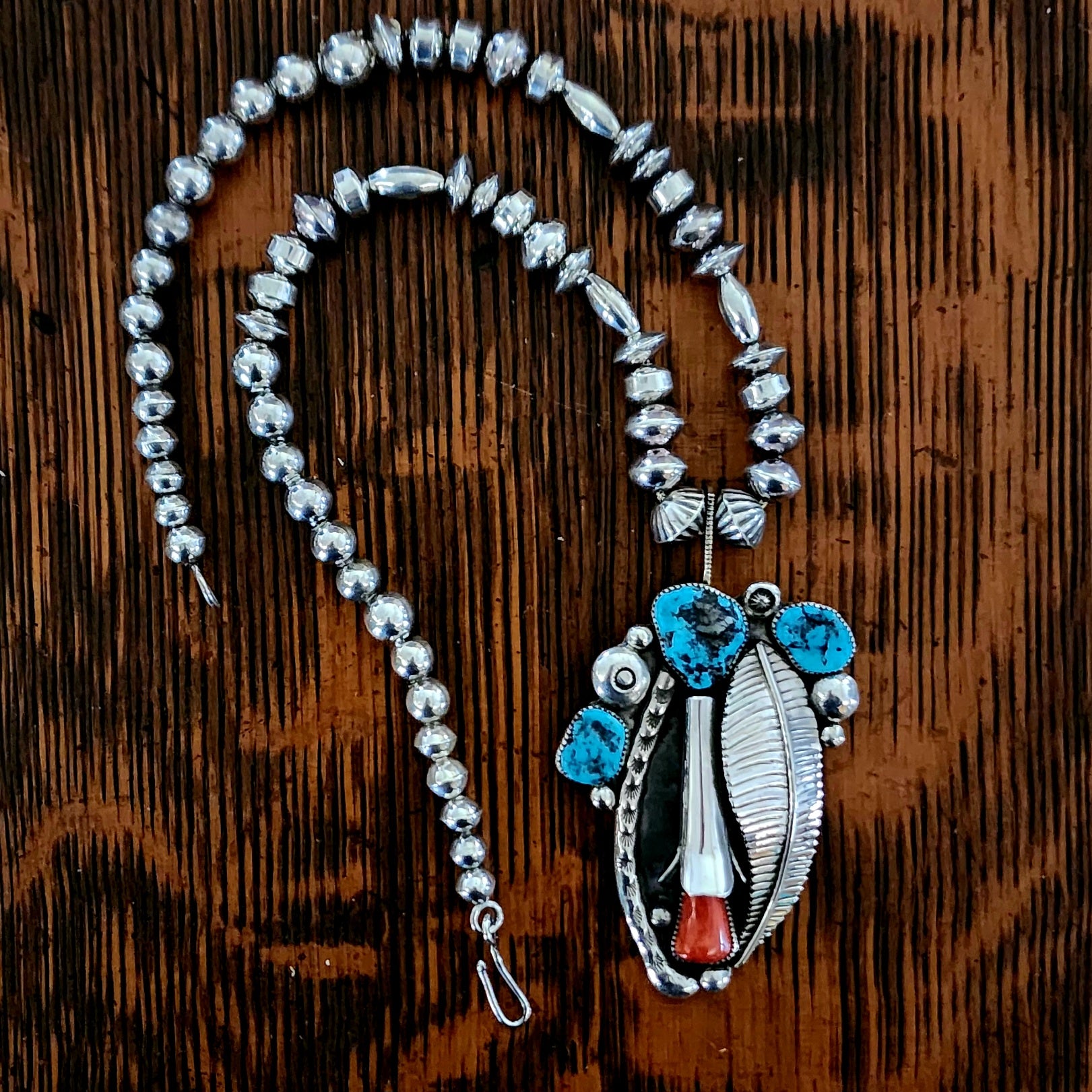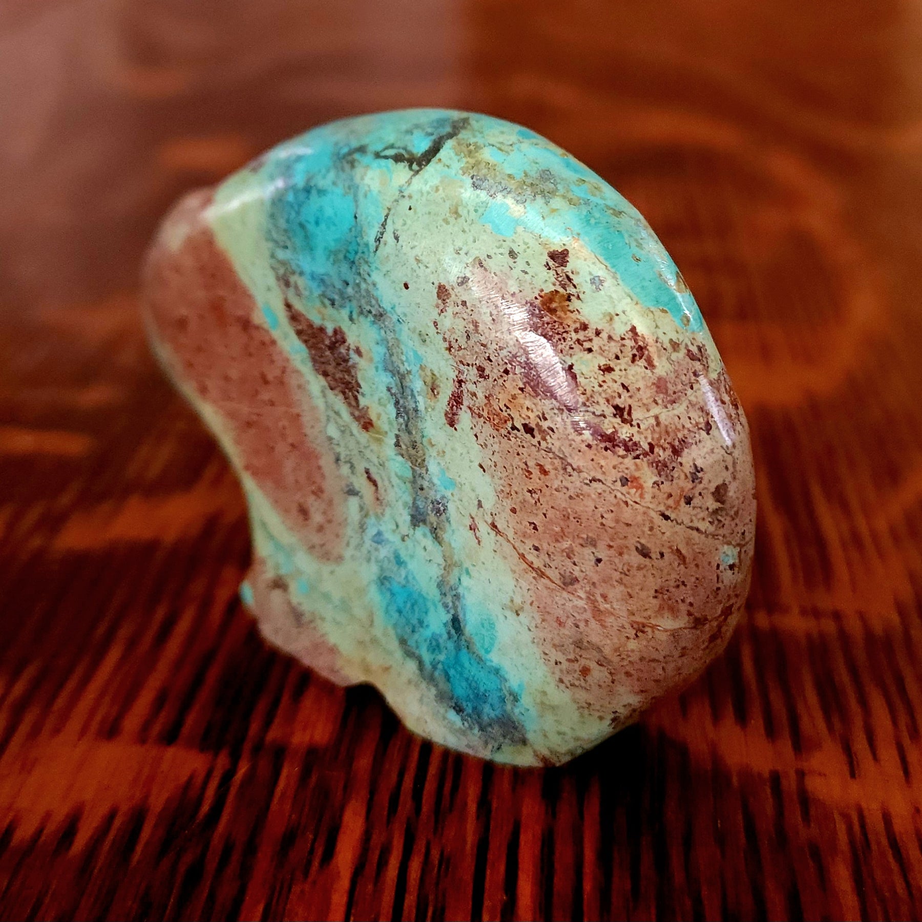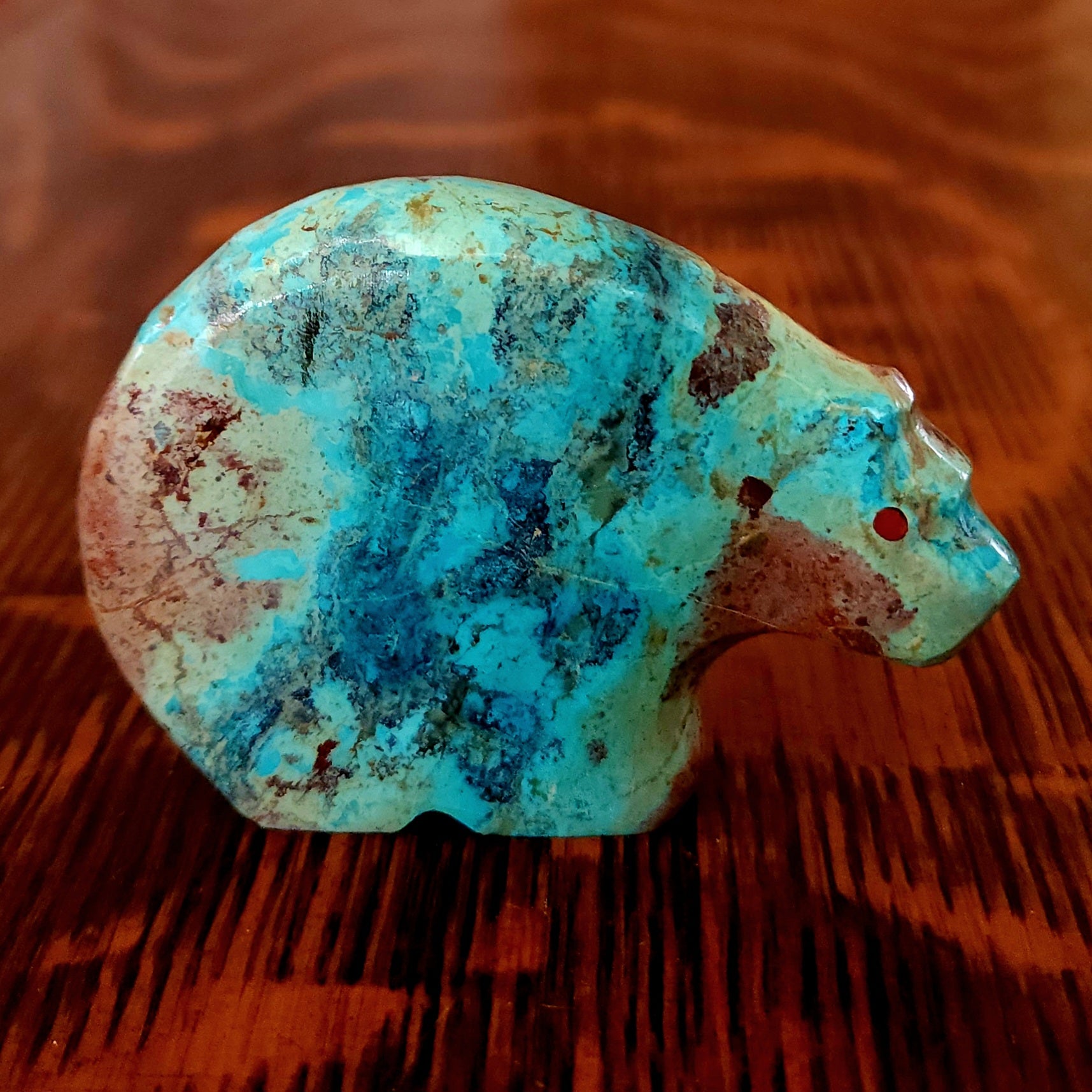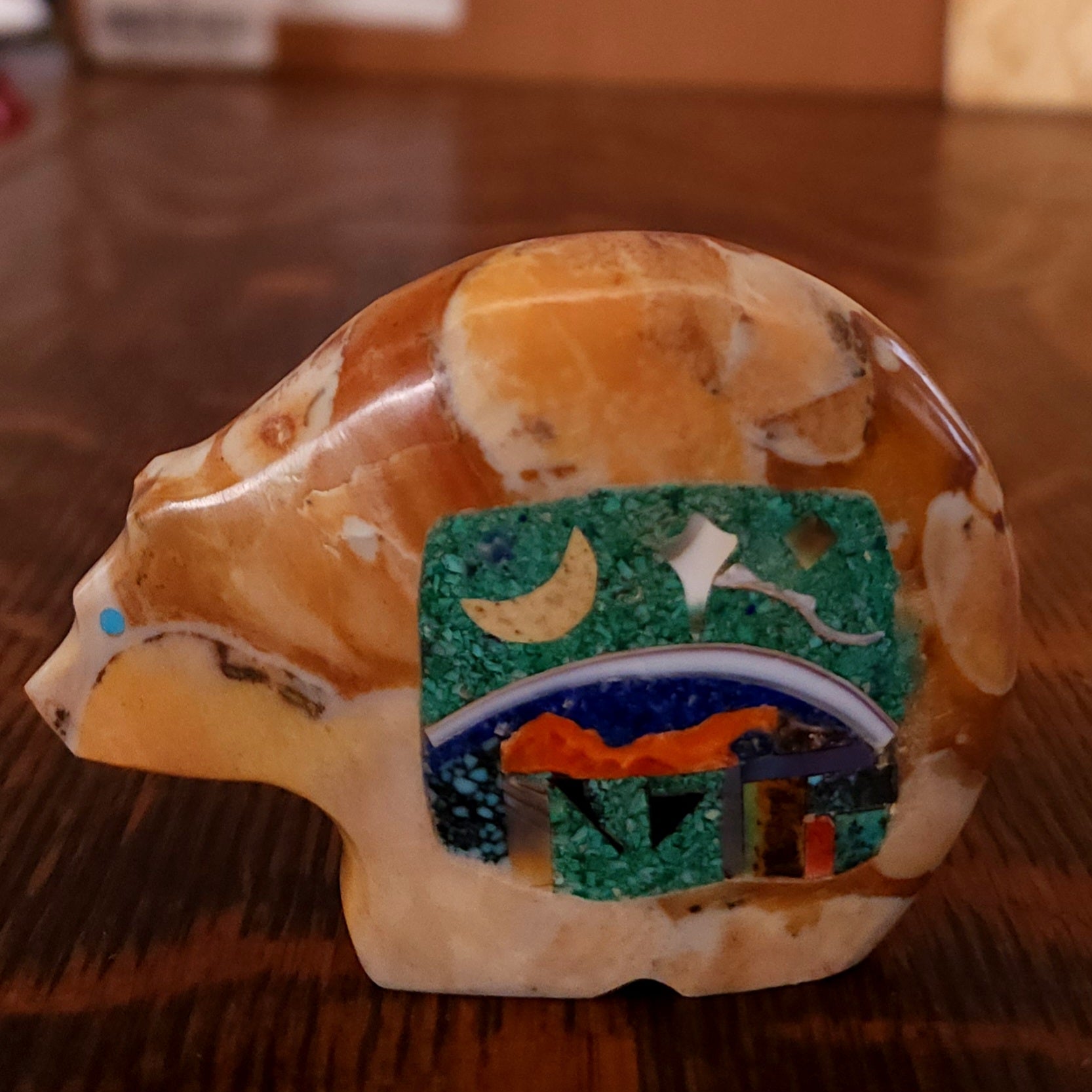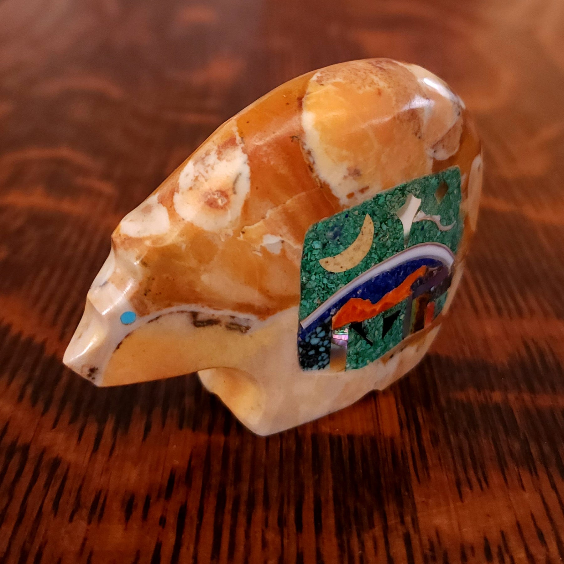 Lynn and Jayne Quam artfully carved and inlaid this Moon Gazing Bushytail from tijilite. It has inlaid turquoise eyes and heartlines on each side. It feels very good in the hand. Signed "Lynn Quam" on the bottom. More about bushytails below.