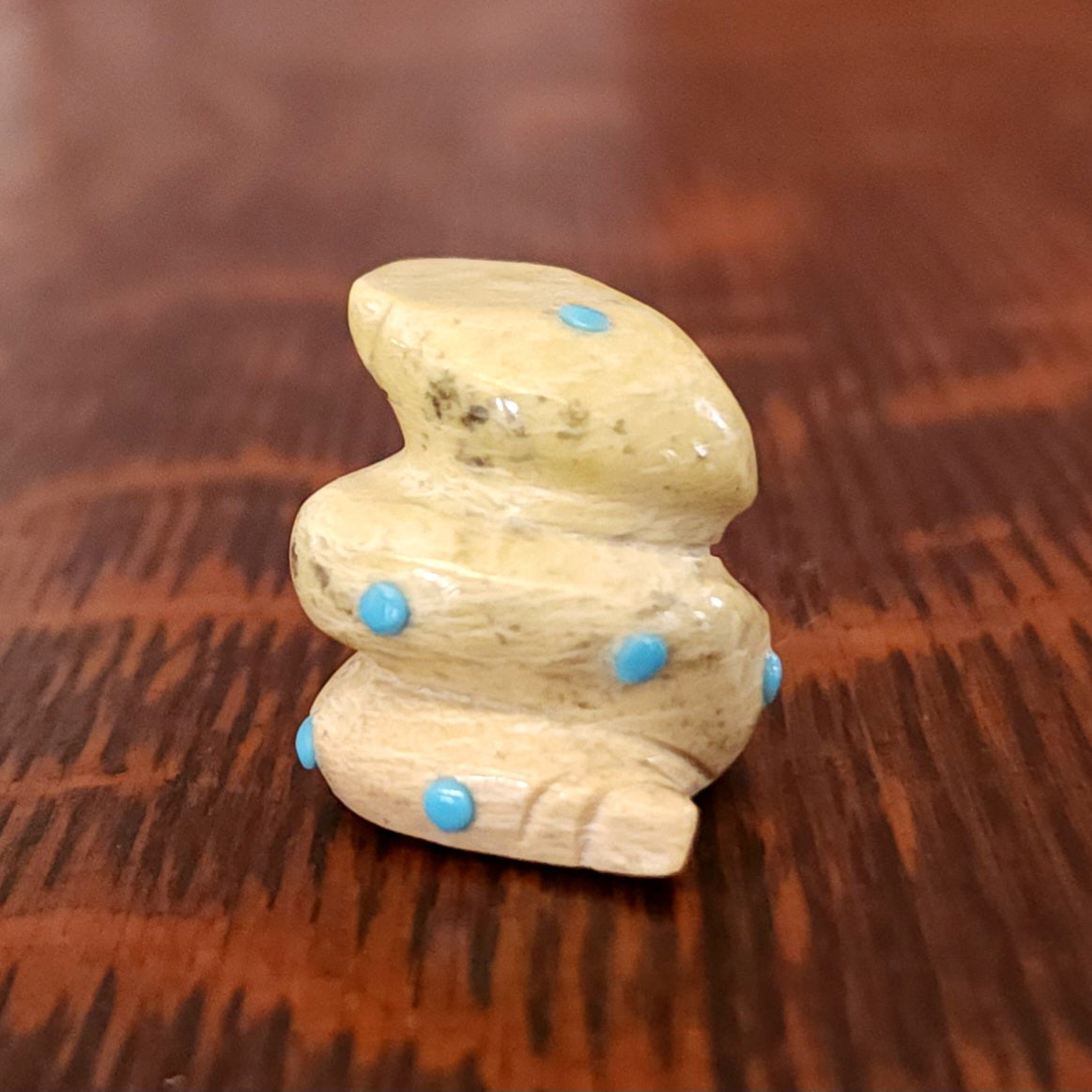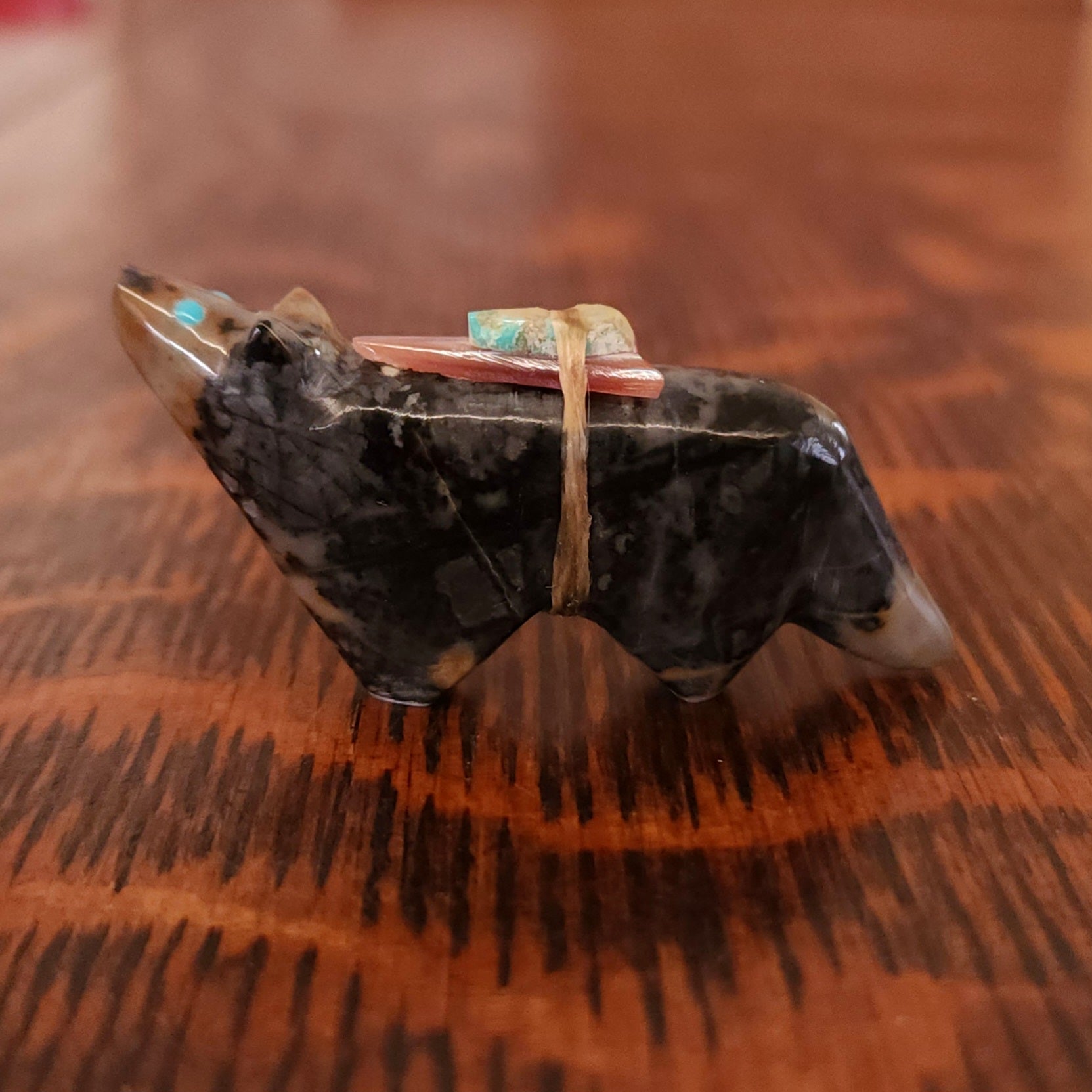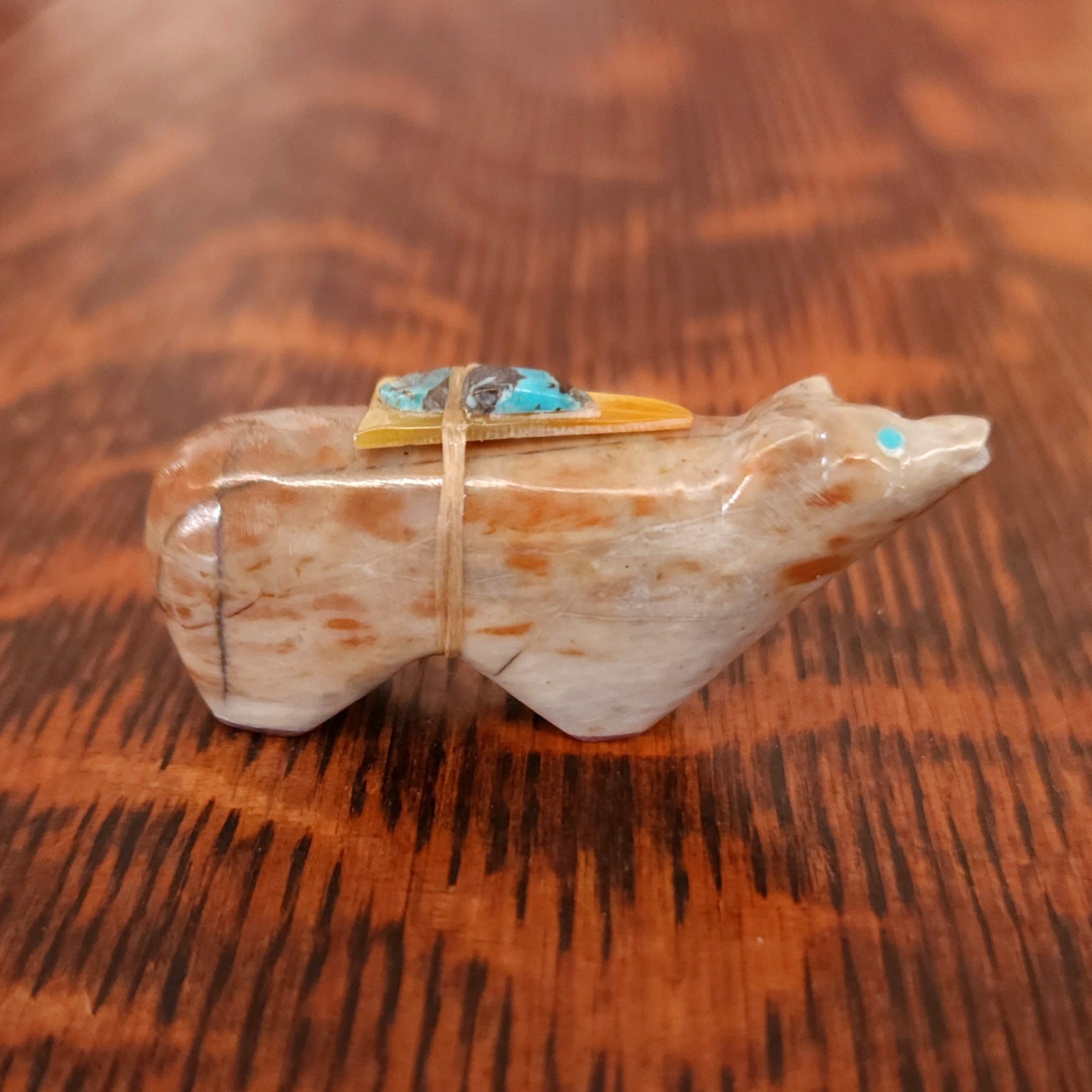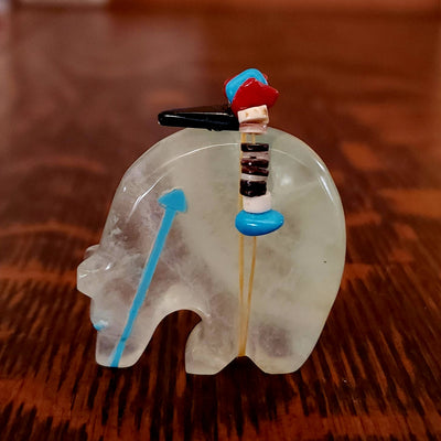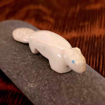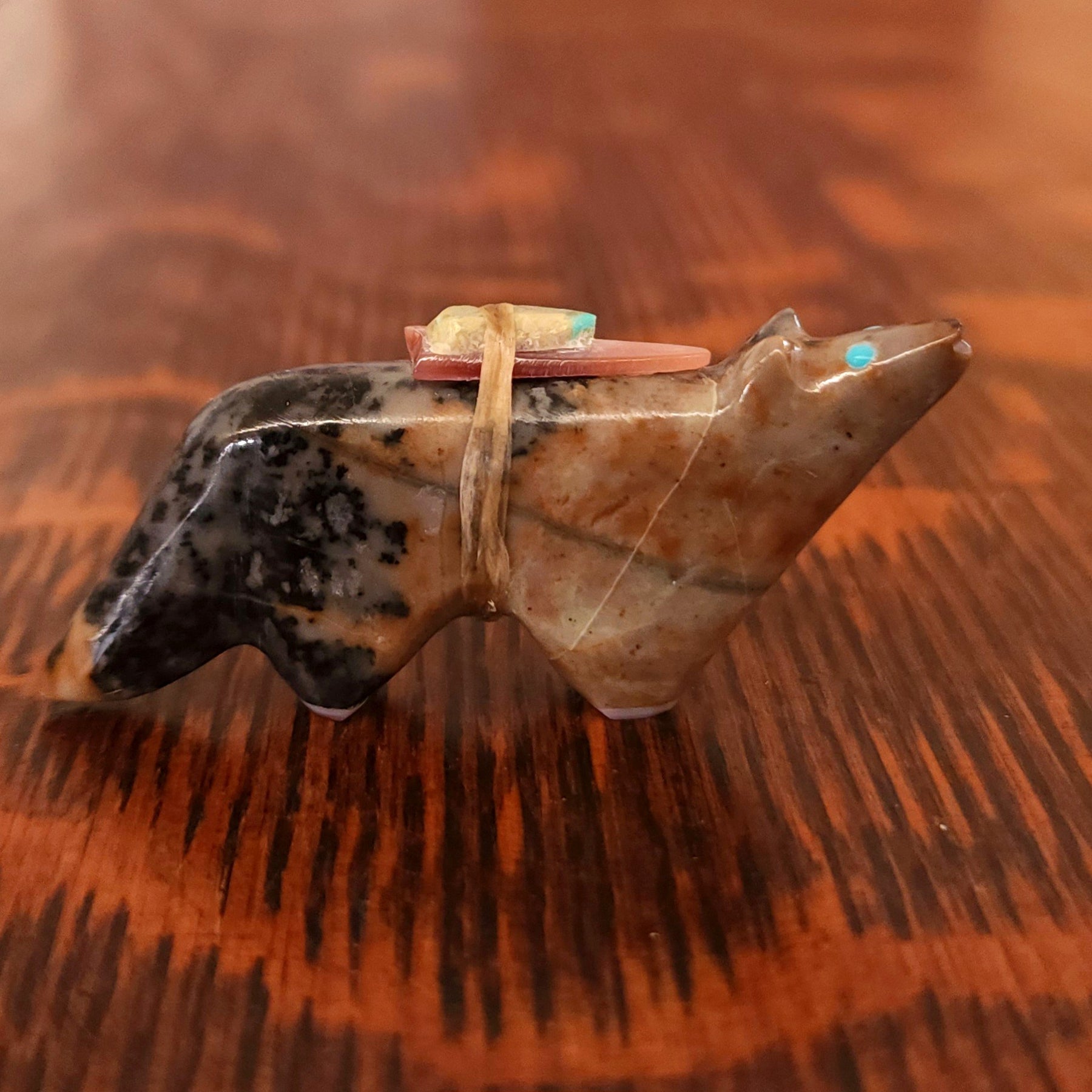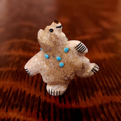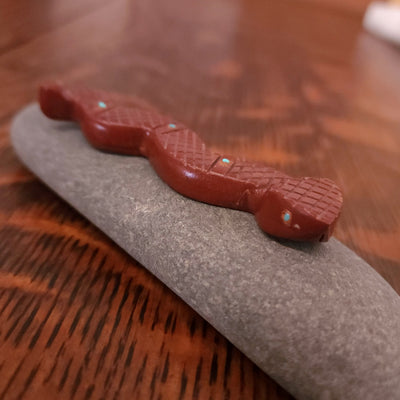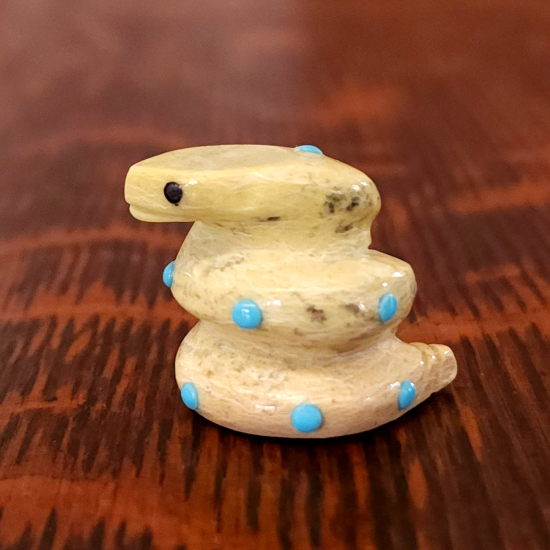 Traditionally, Zuni carvings are symbolically fed cornmeal. Each Zuni fetish comes in a box with a descriptive card and a tiny bit of corn meal to tide them over until they reach you.