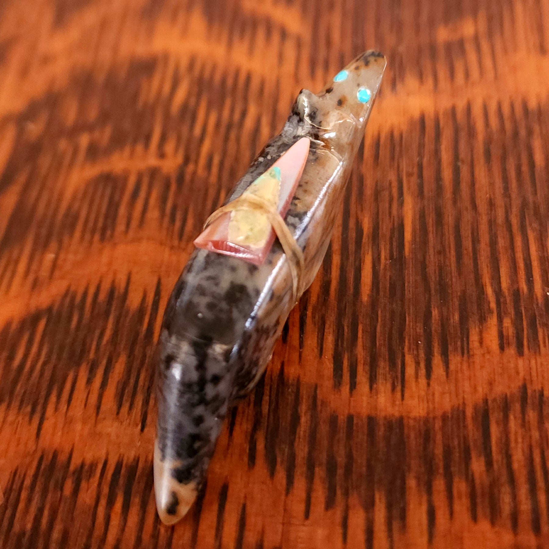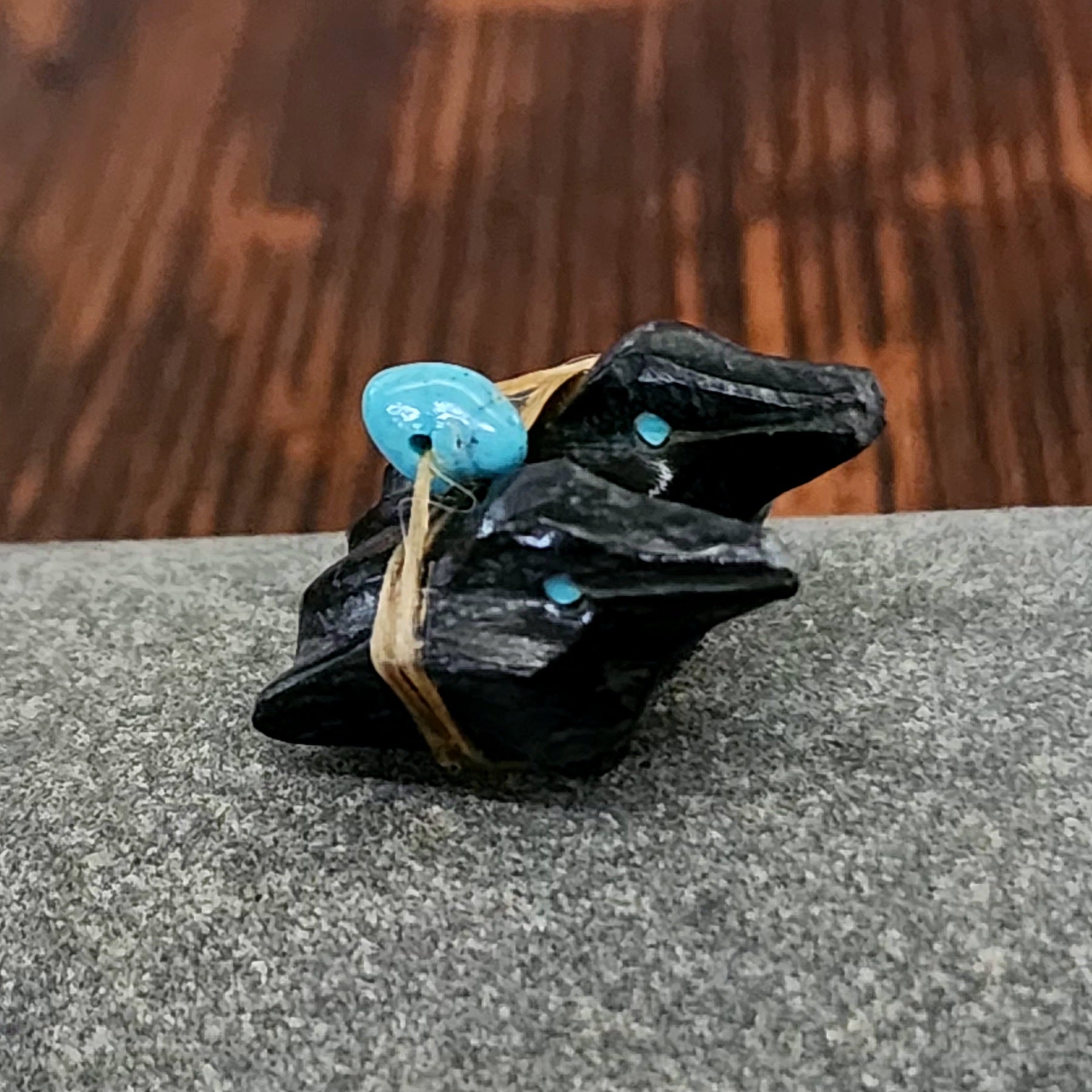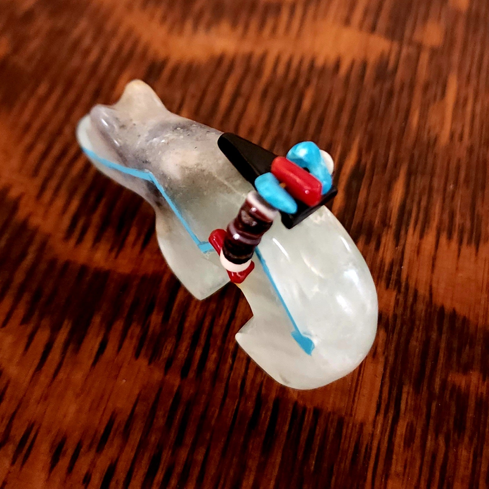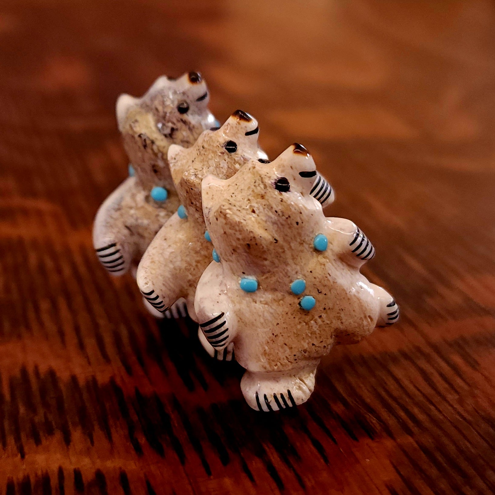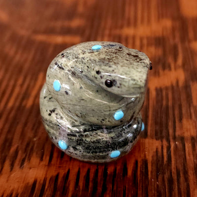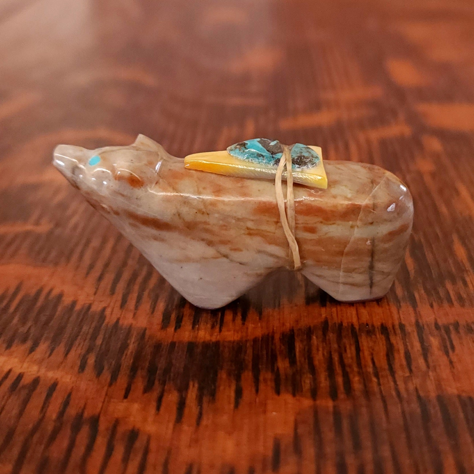Traditionally, Zuni carvings are symbolically fed cornmeal. Each Zuni fetish comes in a box with a descriptive card and a tiny bit of corn meal to tide them over until they reach you.