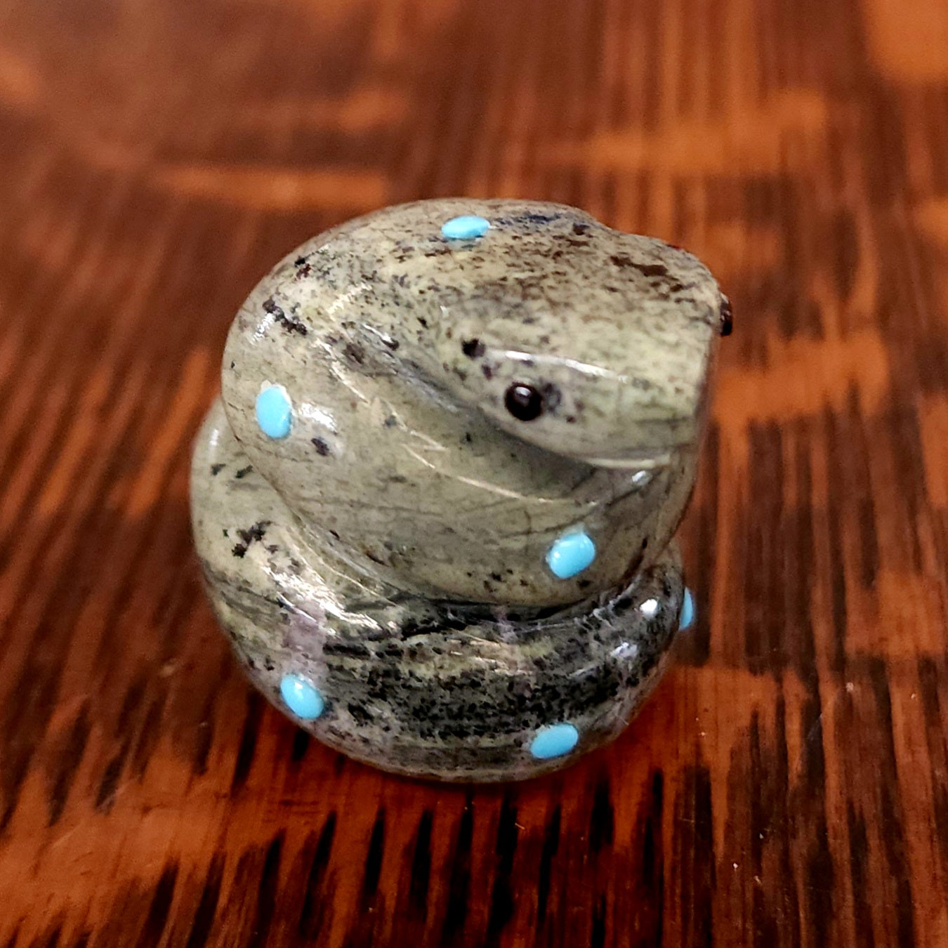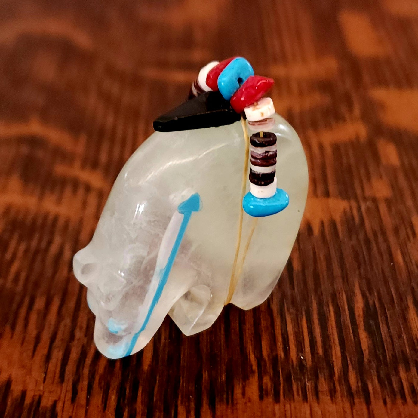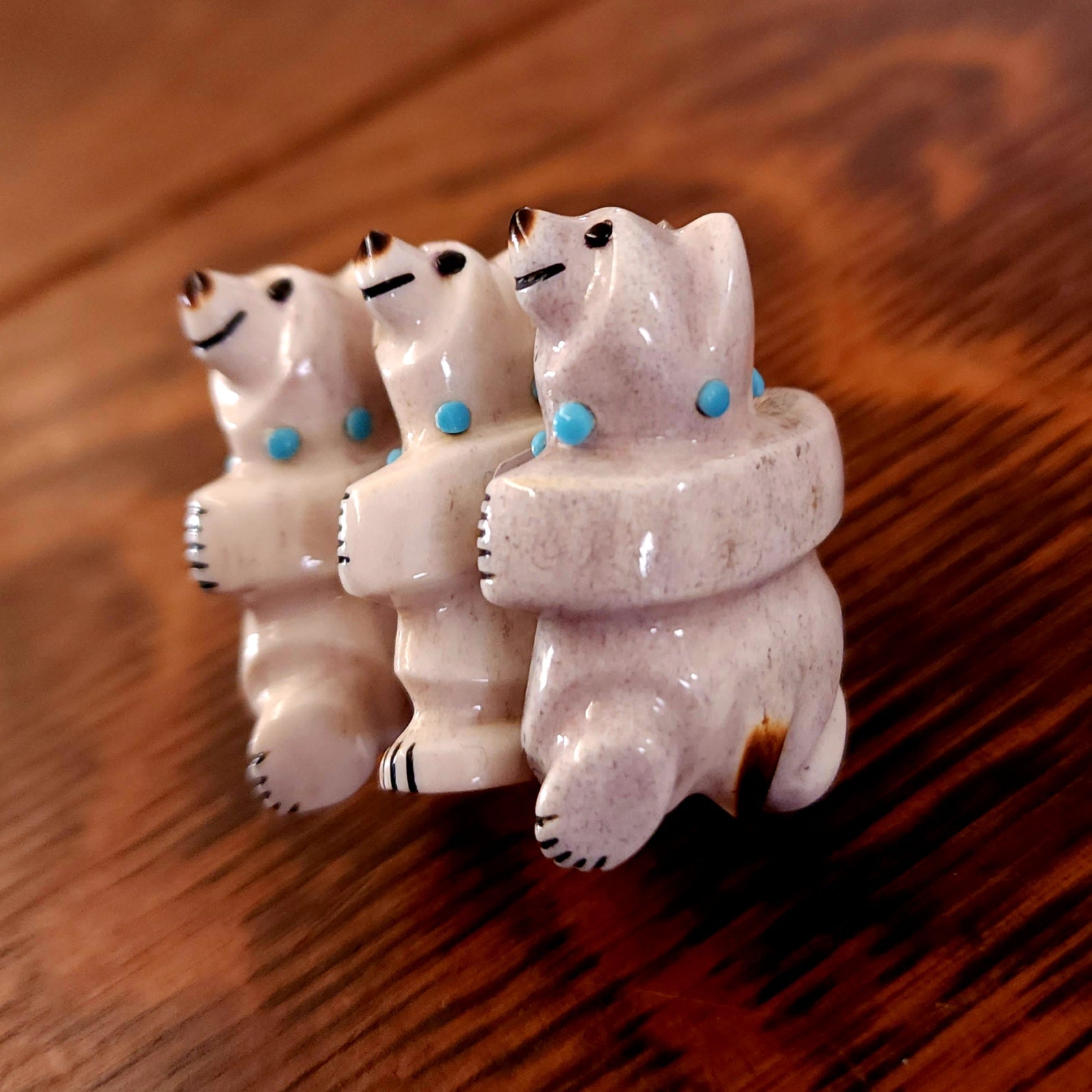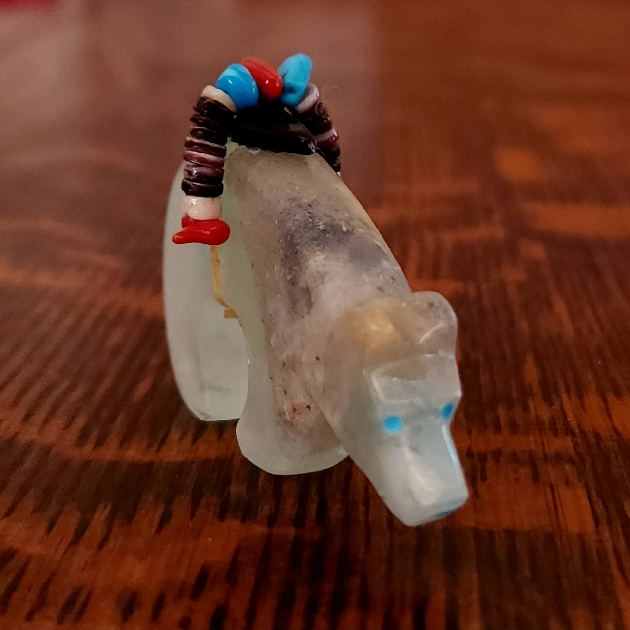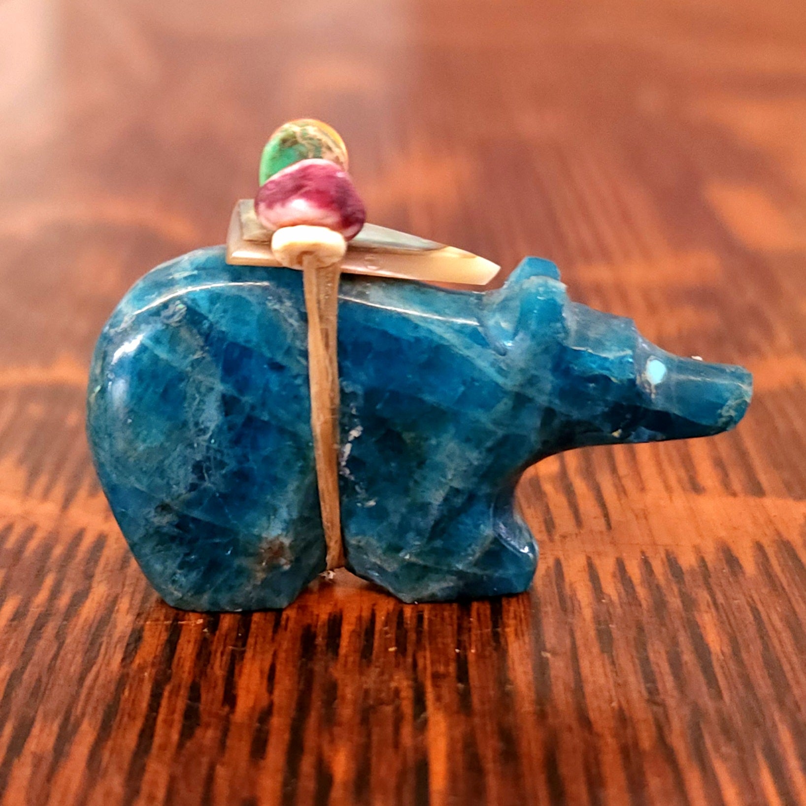 Traditionally, Zuni carvings are symbolically fed cornmeal. Each Zuni fetish comes in a box with a descriptive card and a tiny bit of corn meal to tide them over until they reach you.