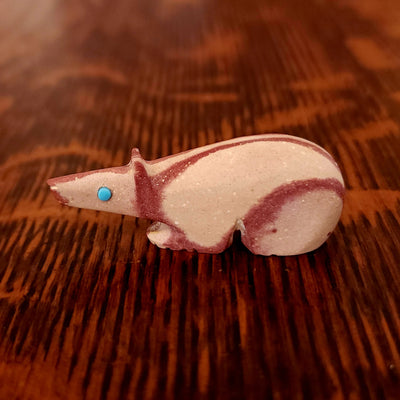 This highly polished Star Gazing Bushytail was carved by Delvin Leekya from Picasso marble. It is gazing up from turquoise eyes...making seeing a meteor shower? It has inlaid pink mussel shell feet and a bundle of a pink mussel shell arrowhead and smaller turquoise on top. More about bushytails below.