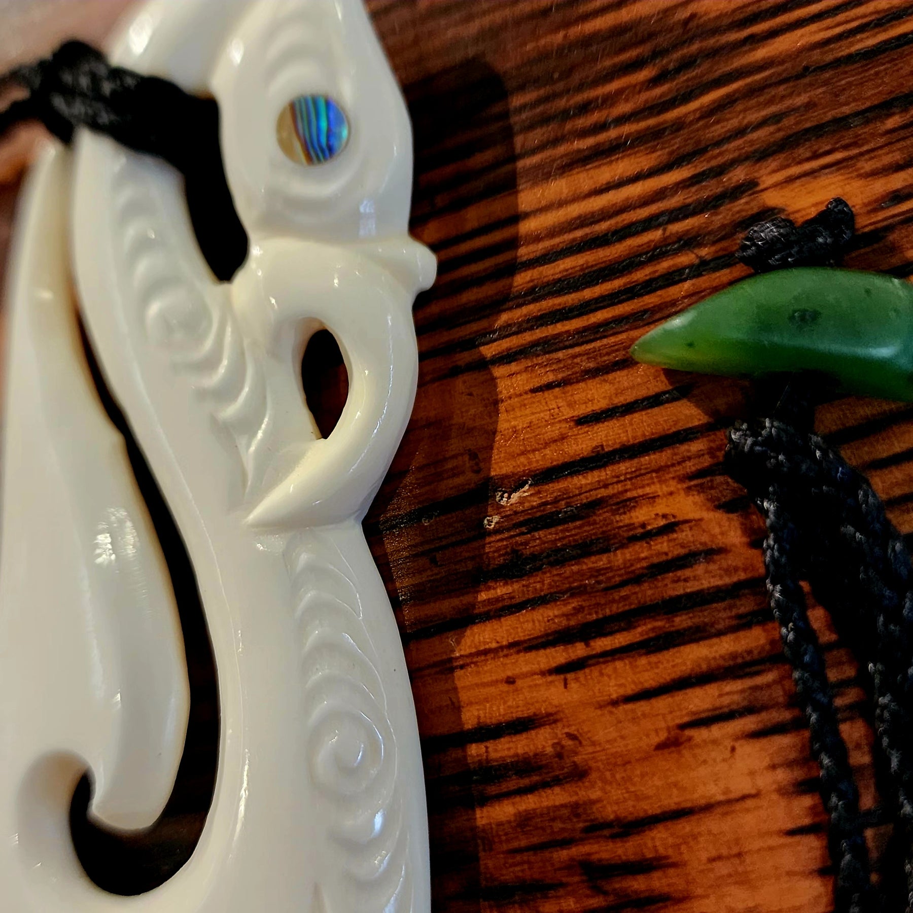 Maori handmade Manaia is an intelligent force of nature in the Maori culture. This Manaia was carved from cow bone and has paua shell eyes. It is strung on hand woven wax cord with a clasp is a green jade bead and round enclosure. More about Manaia below.