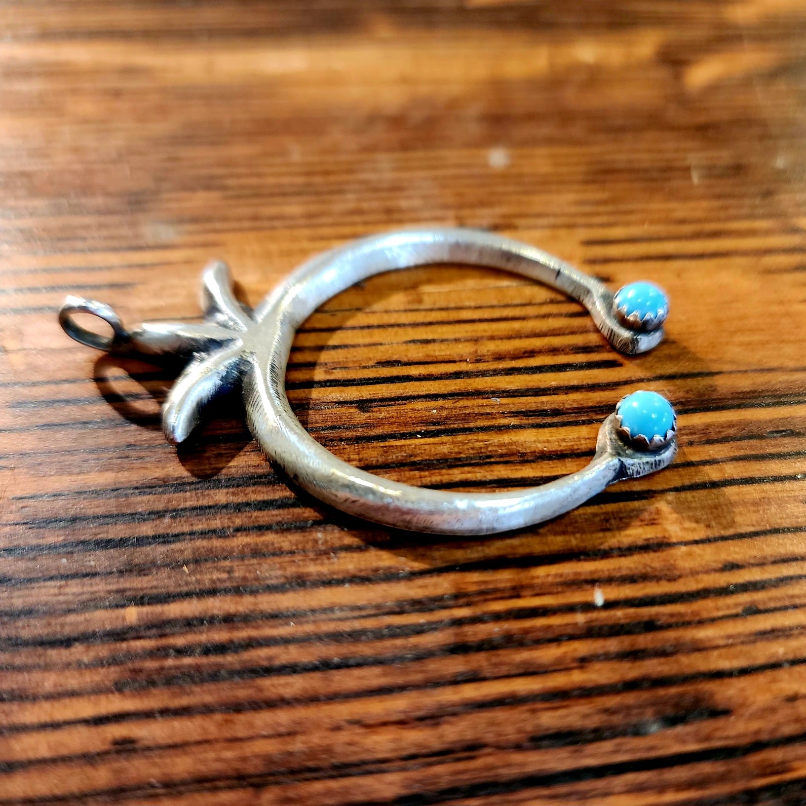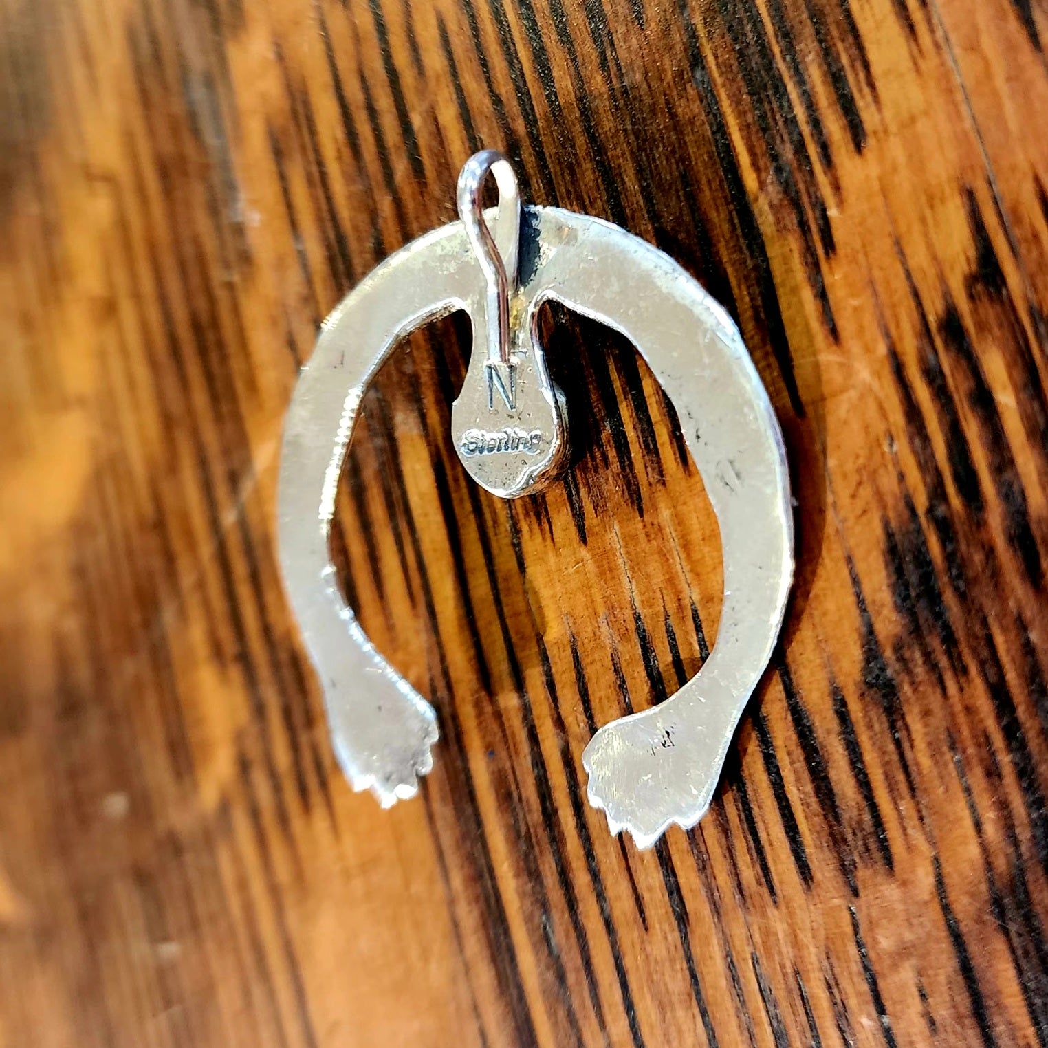 Regular price $99.00 Save $-99.00Navajo handmade using the tufa cast process, this sweet naja has a turquoise stone on each side of the bottom. It has a loop at the top for a chain or to be strung on beads. More about the process of making tufa cast jewelry below - it is quite a process!