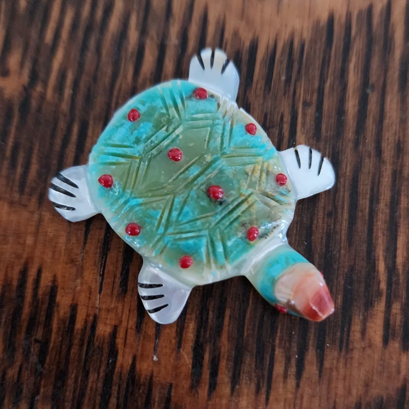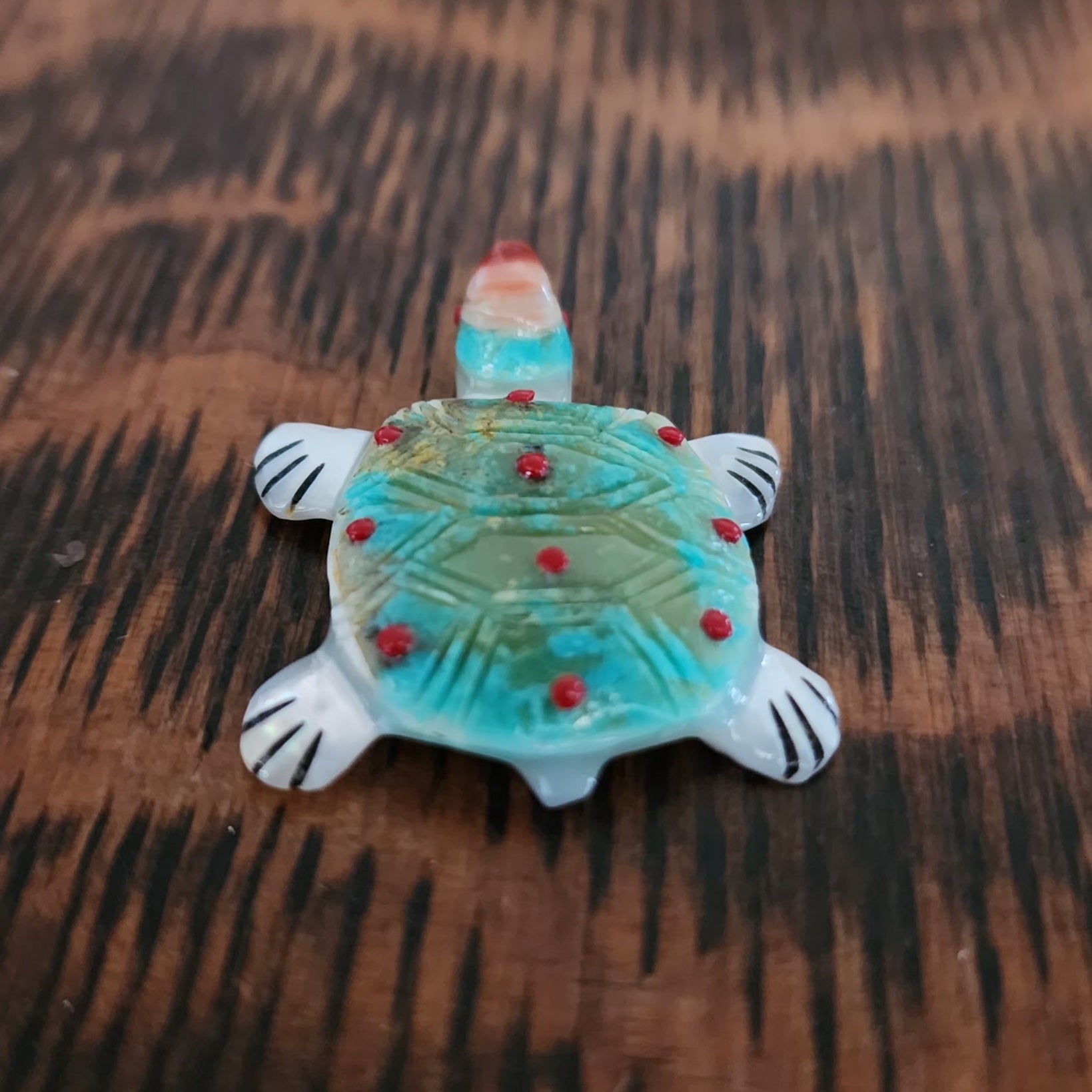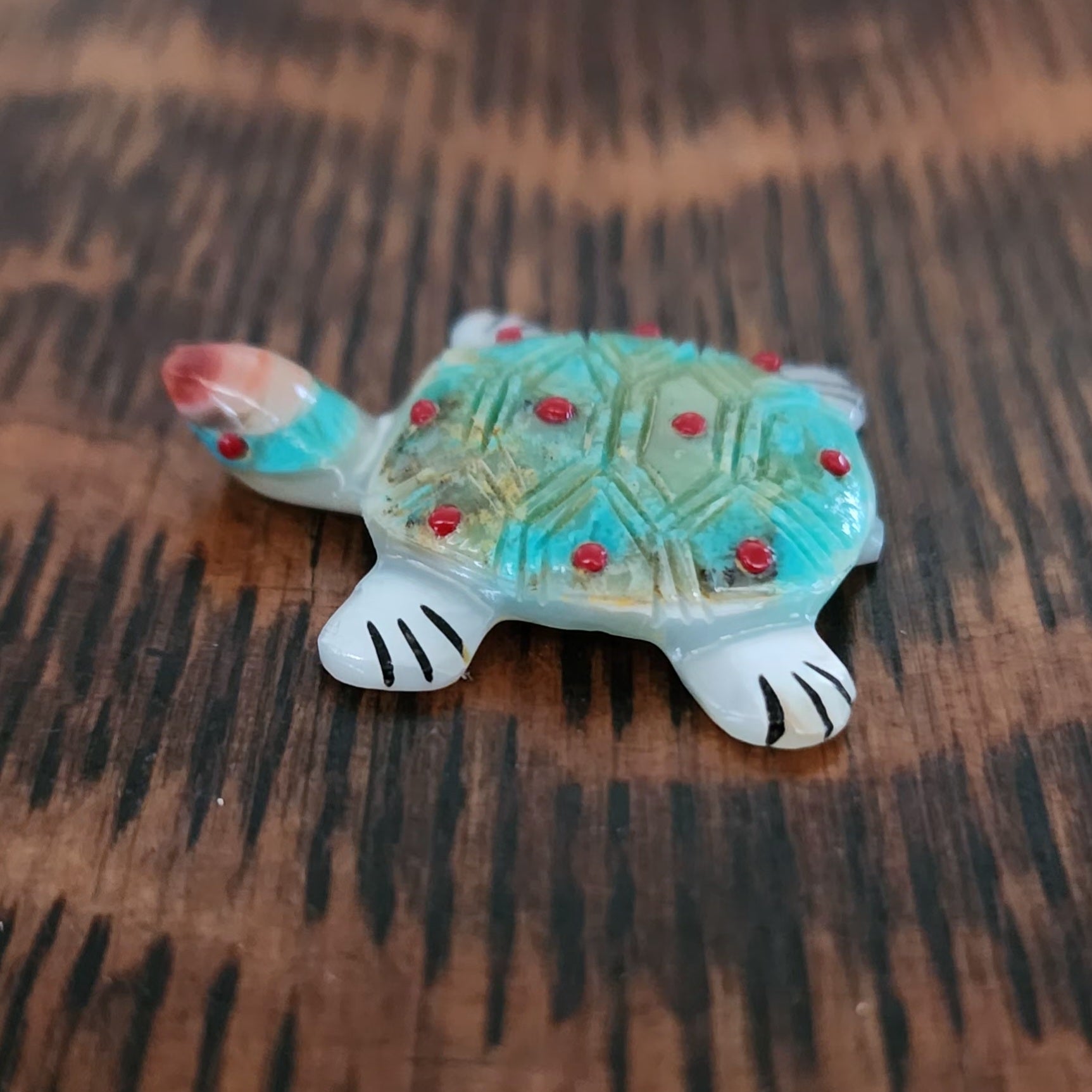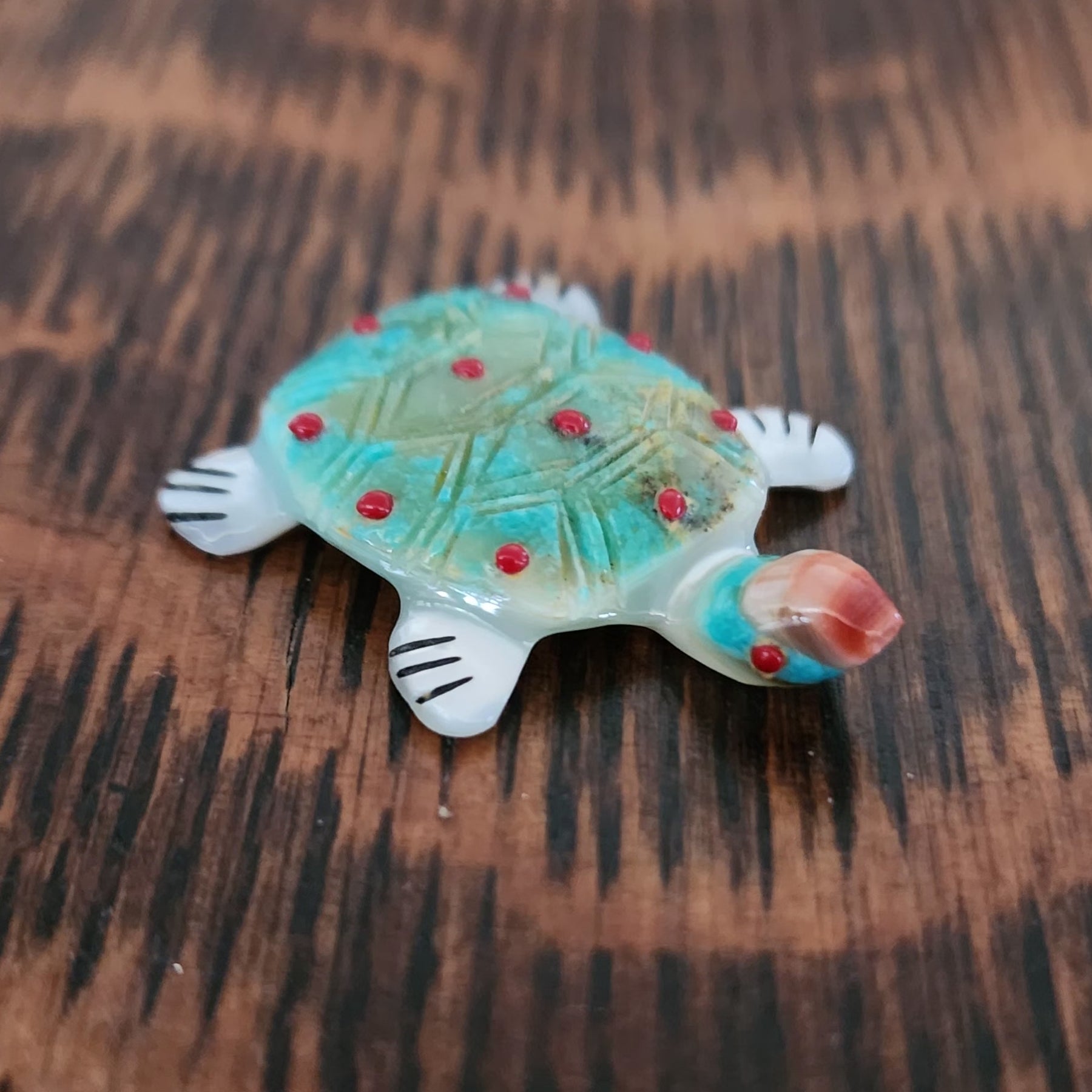This Aqua Sea Turtle was made by Andrew Quam from Zuni Pueblo. The body is carved from shimmering white mother of pearl and the shell is carved from aqua colored turquoise. The has a layer of turquoise and brown shell. Ten tiny red coral dots are inlayed onto Aqua's back and she has red coral eyes. It is so easy to imagine her swimming through warm seas.