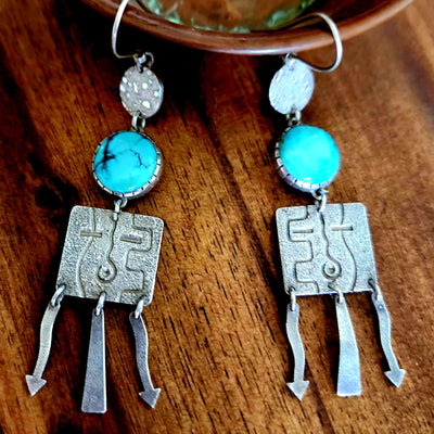 Ric Charlie is an award-winning Navajo jeweler, best known for his exquisite tufa cast jewelry. These tufa cast earrings start at the top with a texture that reminds us of the universe. The stones are natural domestic turquoise - Ric only uses the best! The face is a Navajo Yeibichai, an intelligent force of nature. Dangling below are the elements of lightning and rain.